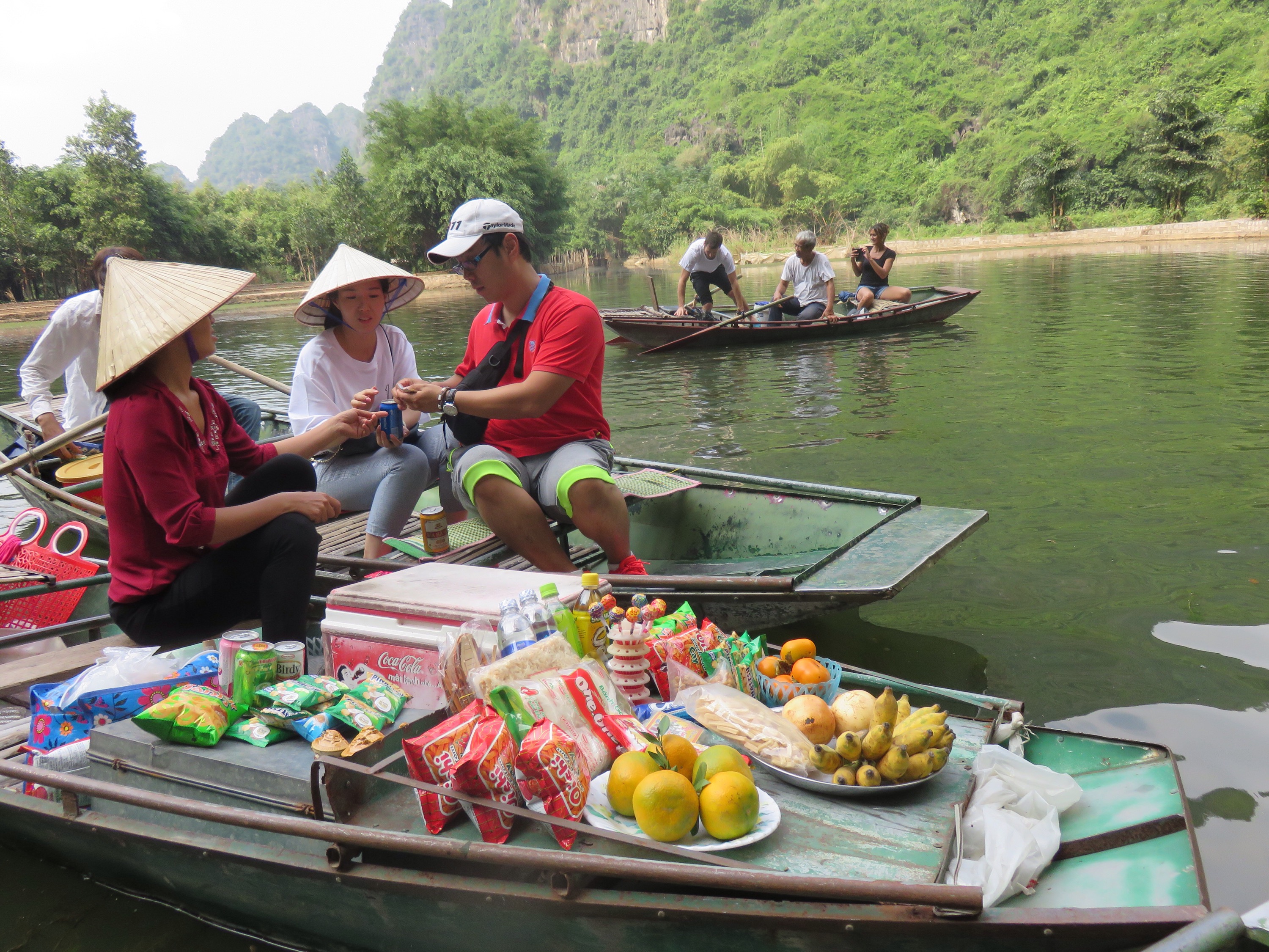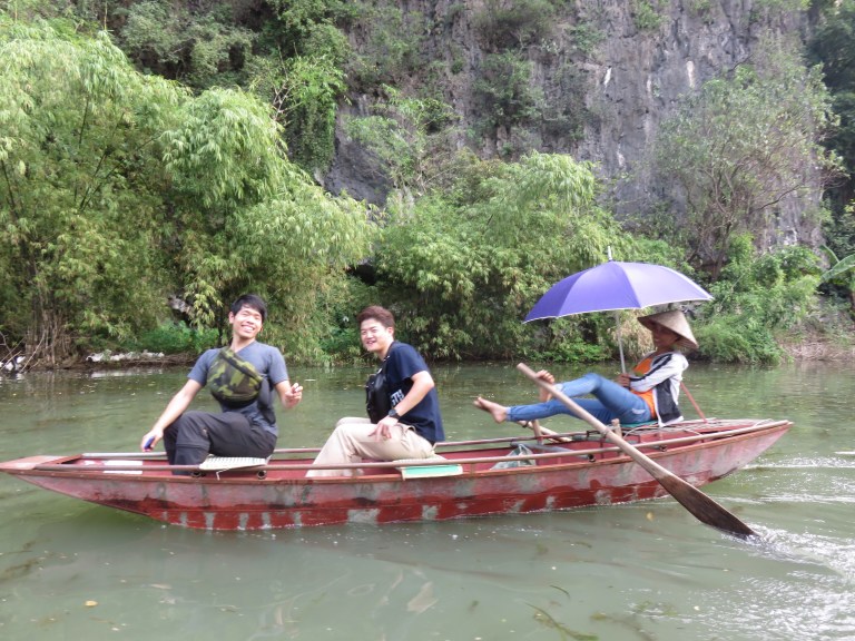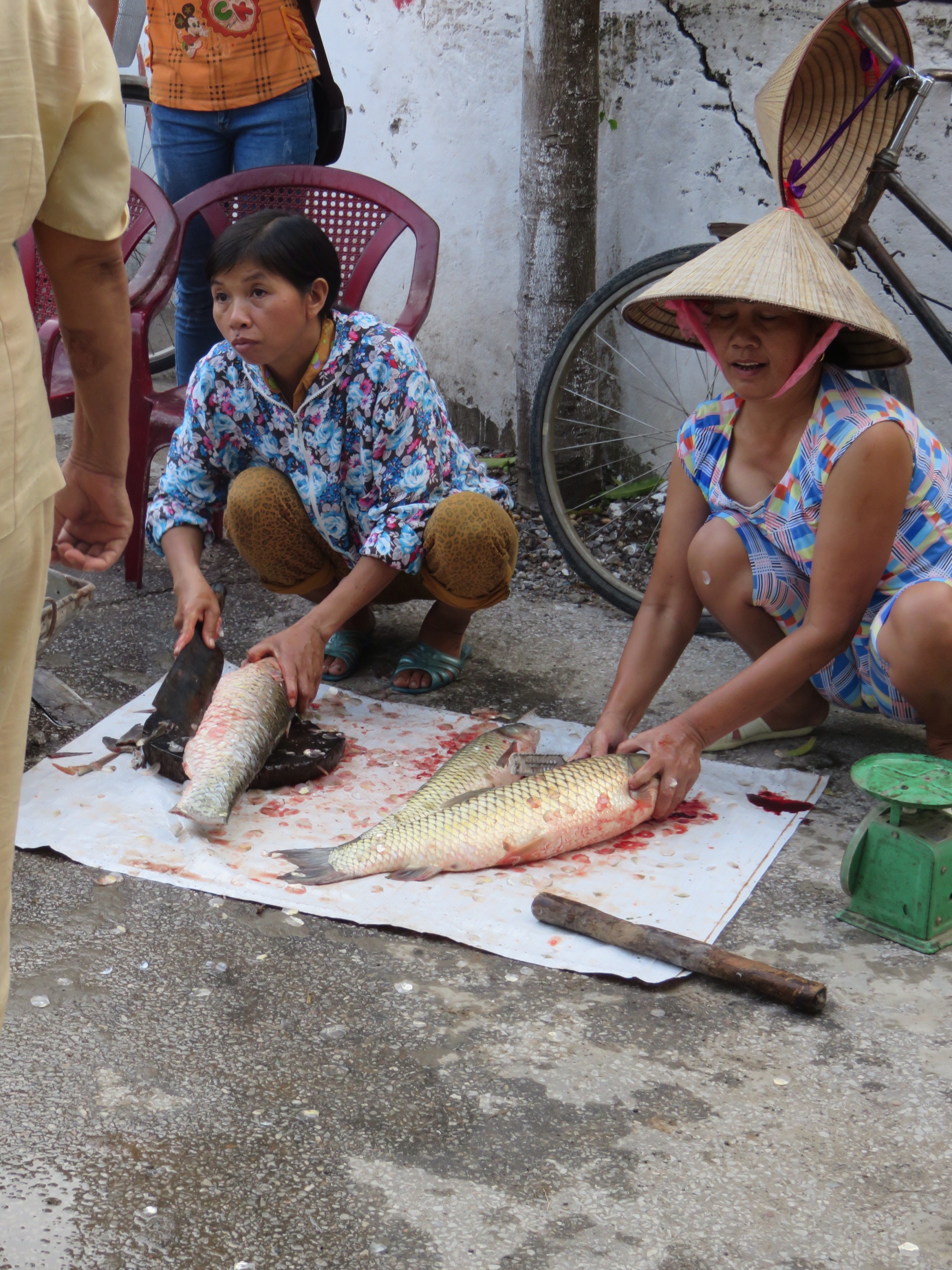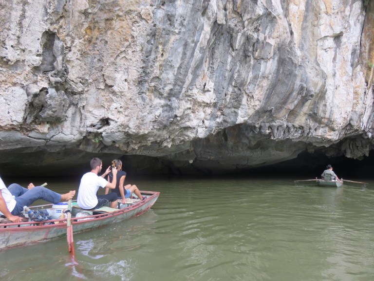 Leaving there were head to Tam Coc which is beautiful and is called Halong on land. We have a Buffett lunch which is traditional Vietnamese and pretty tasty apart from goats which wasn’t so keen on. After lunch pair up to go on a boat ride through the halong peaks and going though caves which is all breathtaking scenery. All boats are rowed using their feet which is pretty cool to see. The ride is about 30mins each way and there are a lot of boats doing the tour, even a wedding. Where we turn around to come back there are a lot of supermarket boats and I get guilt tripped into buying our rower a drink, which I definitely don’t mind as it looks hard work but hate being told or hassled to do itAfter the boat, we grab some bikes and cycle around the rice fields and local farm houses while passing women killing and gutting fish which is bit of a sight.