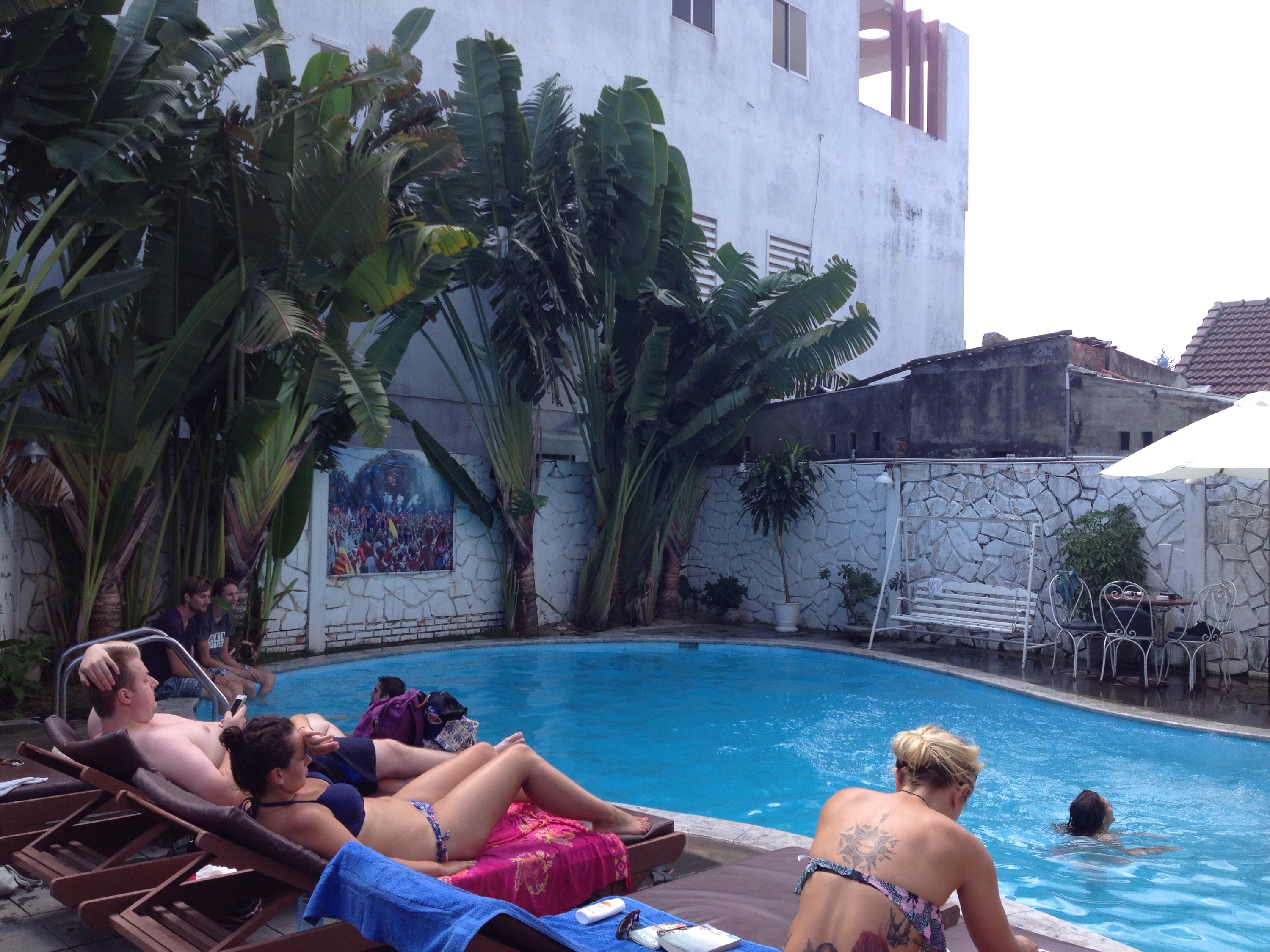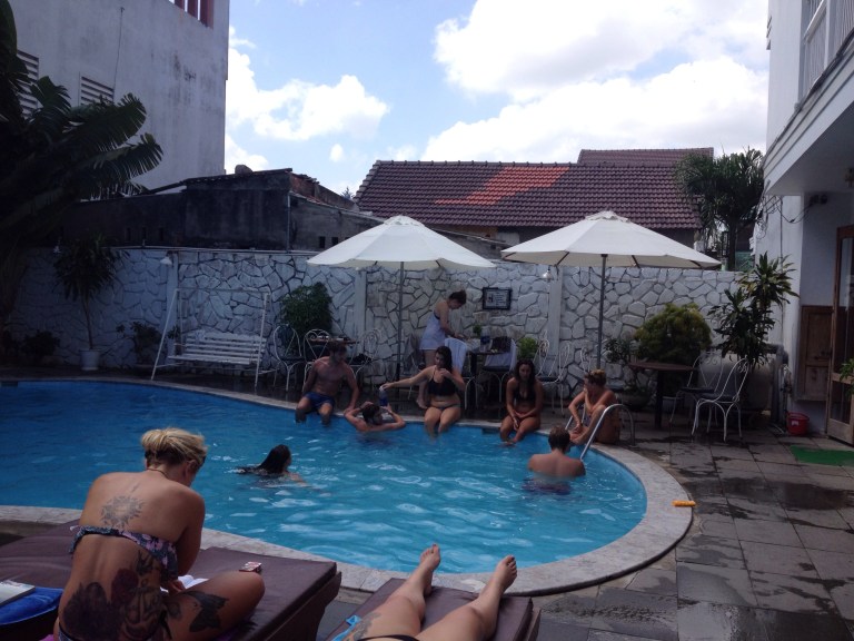 With a quick, cheap and easy flight compared to the 24hour bus option I arrive to lovely blue skies and a nice hostel called sunflower. Receomnded by other travellers have spoken to, its got a nice pool and good atmosphere although the rooms not as nice as central. Deciding to go for a walk, I go the wrong way and end up on route to the beach not realising how far it us and not seeing the bikes at the front. Eventually getting there in the roasting heat, it’s definitely worth while and the beach is beautiful and goes on for ages which I walk up for about an hour. I bump into a group who was on the halong bus and have a beer at the beach bar. Getting an offer of a bike Lift to avoid the 45min walk back, that fails as the bike is buckled so end up using one if the motorbike taxis instead. Rest of evening is spent by the pool bar and join a few others who go to a nice family run restaurant next door who have the most gorgeous puppy and are so welcoming bringing out free nuts and spring rolls and going around braiding the girls hair on the tablet. An interesting Group from London, Canada and Germany.