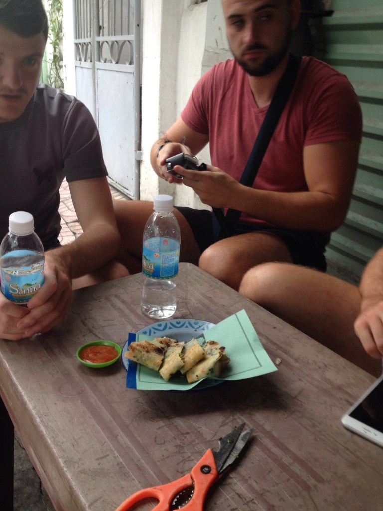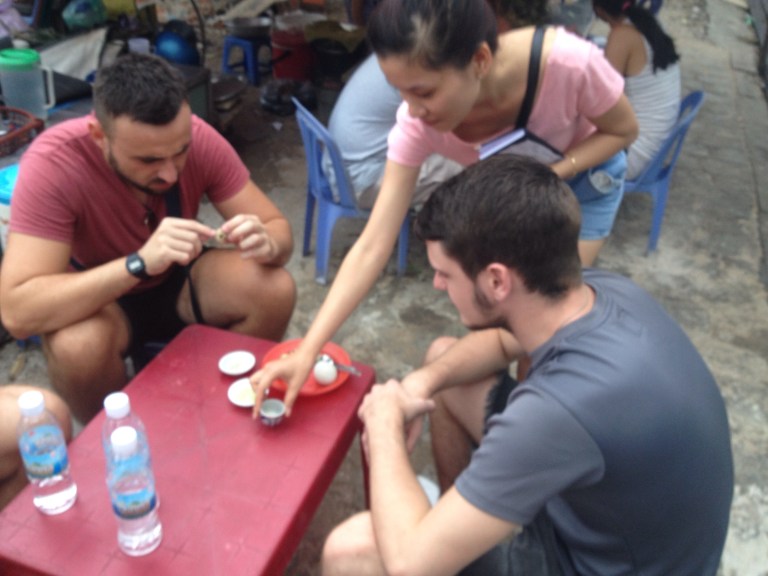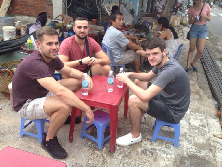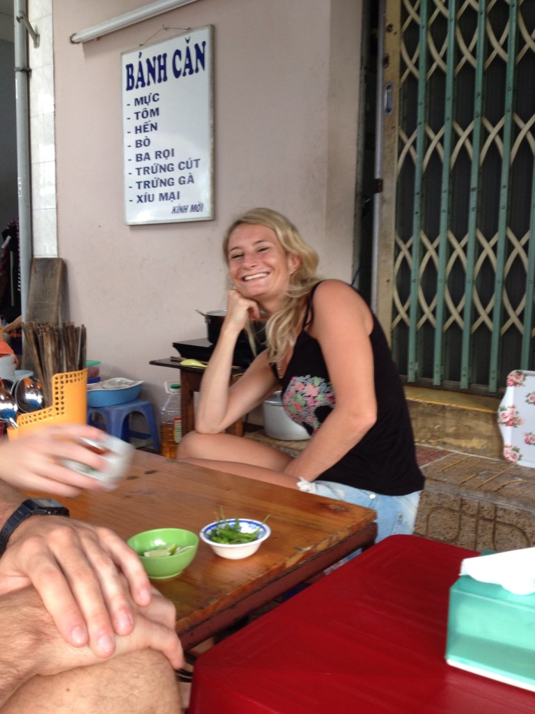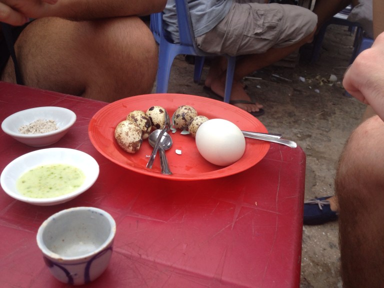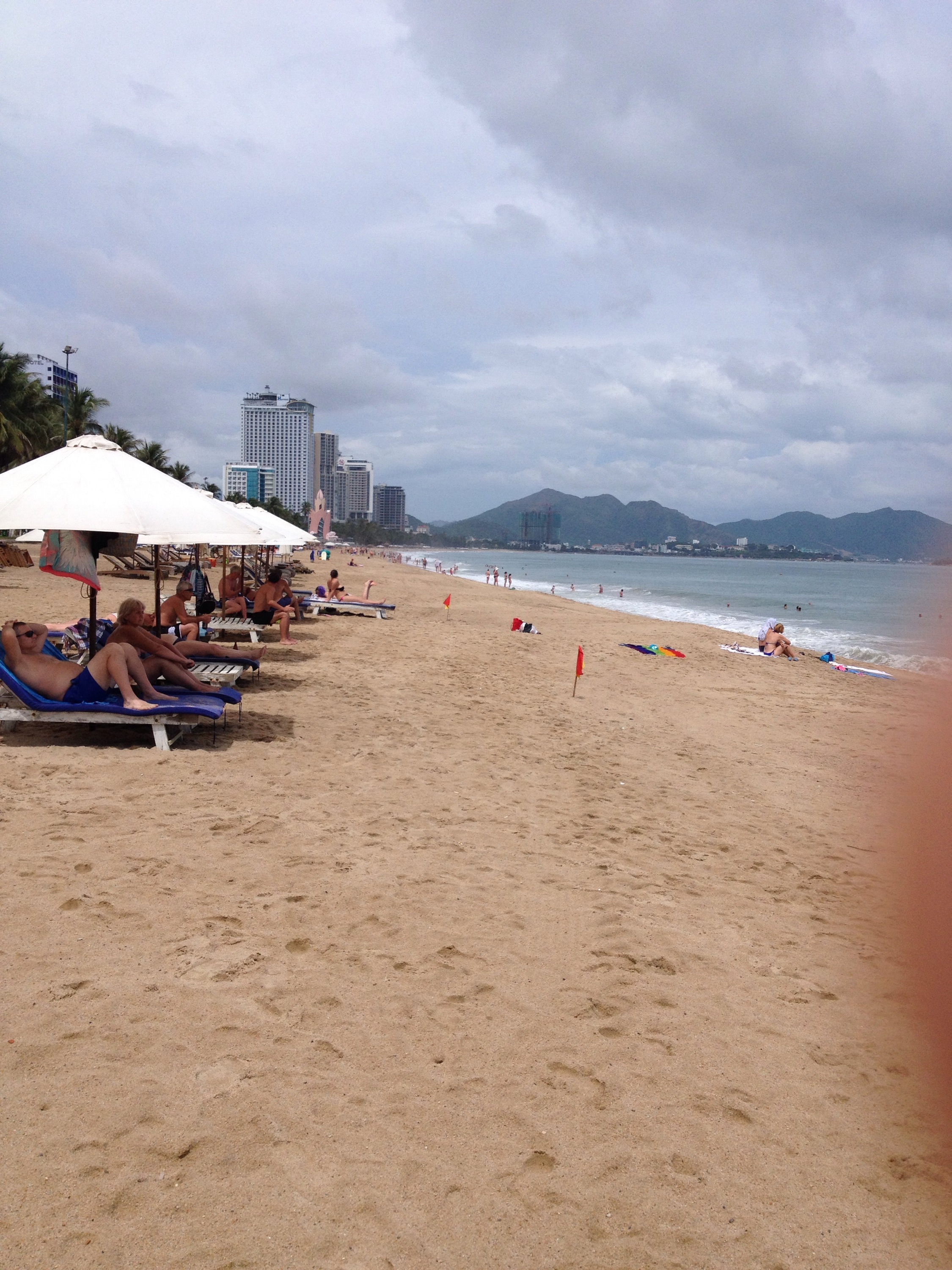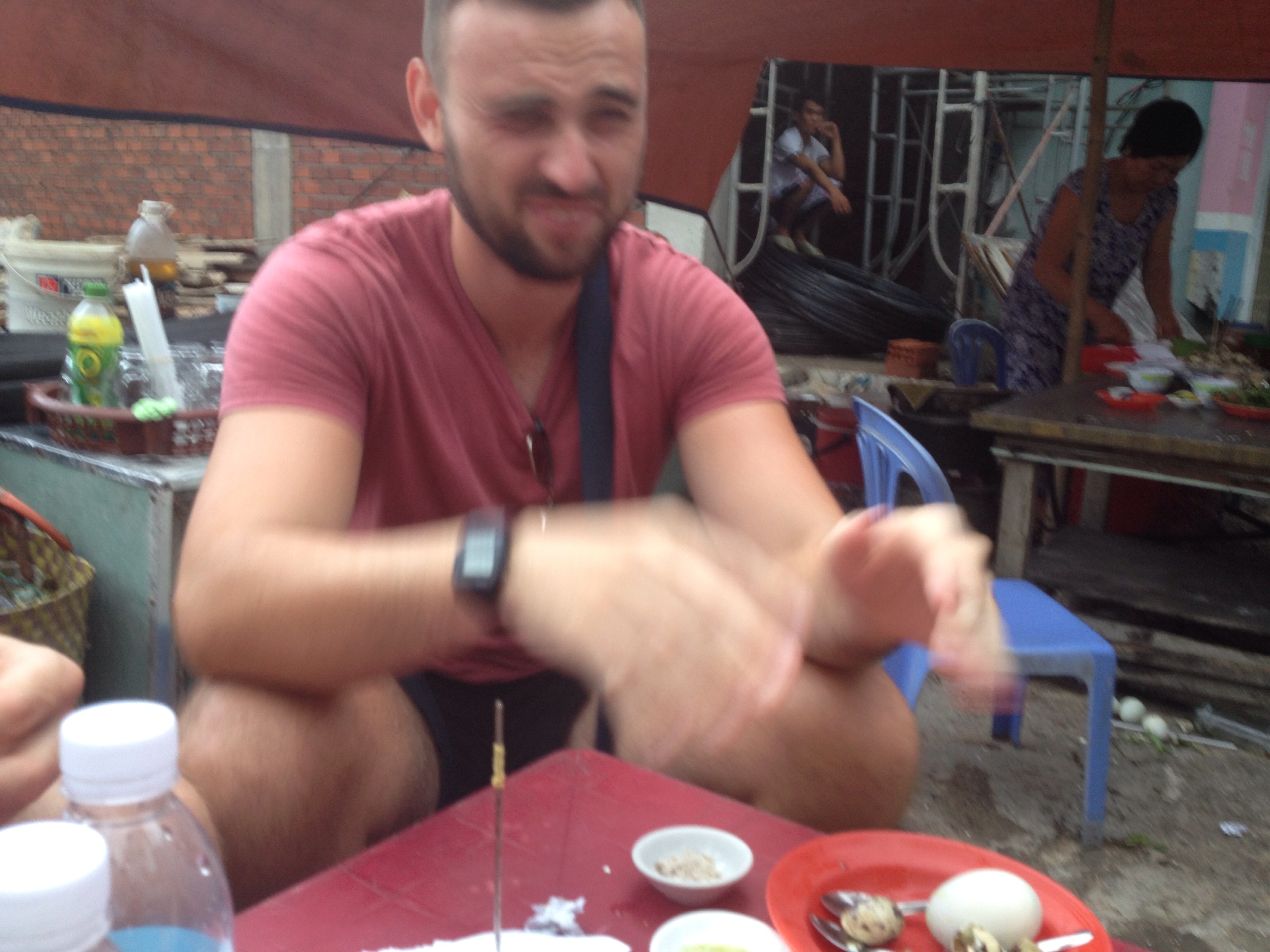 Quickly realising that there isn’t really much to do in the town apart from the beach and nightlife, I meet up with the Hanoi boys and James from London who is staying in the hostel and in the same room as Darren and Tom where we head to the beach for a few drinks grabbing what little sun there is. Then having to head back for the hostels street food tour we spend the next 2 hours walking through the more authentic parts of Nah Trang via the markets stopping off at 8 different places to try all the real Vietamese food and sitting at the smallest table and chairs! Quite funny to see the lads all squeezing onto those! So avoiding any seafood most of the dishes are lovely but the 7th is pretty grim and is quail eggs and fermented duck egg which looks pretty rotten and you can actually see the shape of the duck and start of it growing feathers! So James is the only brave one to try the duck but it didn’t seem to go down too well. The quail egg went down better but I wasn’t game enough to try it! So now all massively full we go back and change to head out stopping to buy a bottle of vodka to get the night started and drink on the roof bar. Then when that runs out head to the next door wave bar for drinking game having to down our drink on an ace so meant we ended up going through quite a few cocktail buckets. Luckily they were buy one get one free which was even better! So leaving there quite hammered, head to the Why not bar for jaeger shots and more drinking staying about an hairy until we leave with another group on a hunt for club, loosing Tom in the process who heads back as so drunk and us wading knee deep through the street rivers after another downpour. After not being able to find the club we end up in a weird little bar drinking til about 2 before braving the even deeper street river by now up to our thighs… Fun and games!!