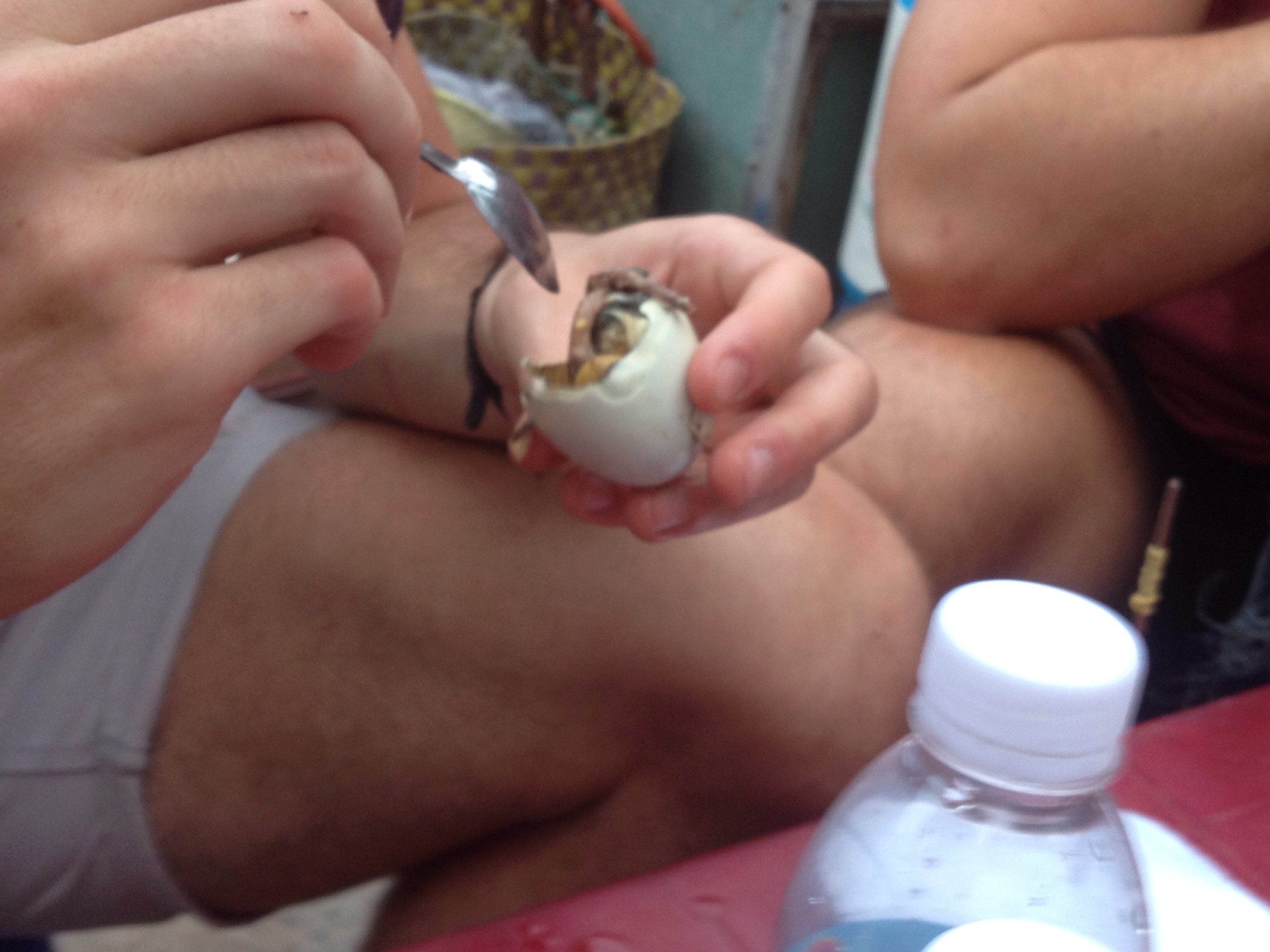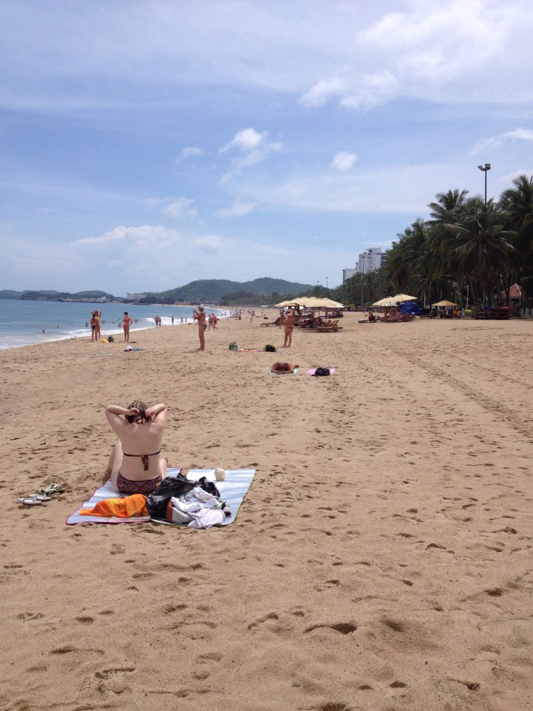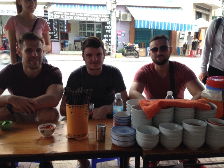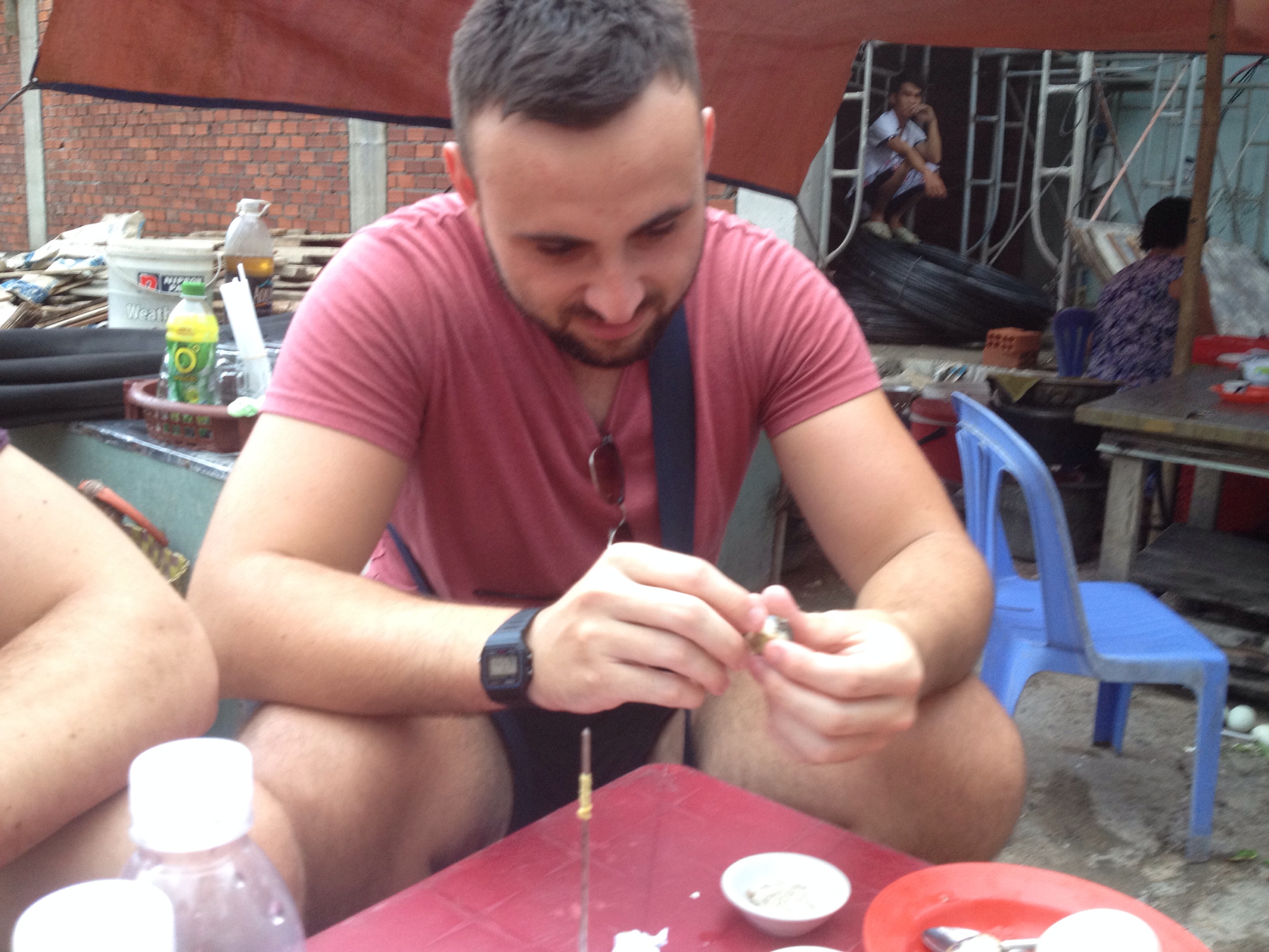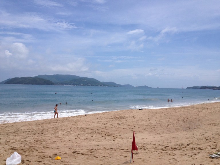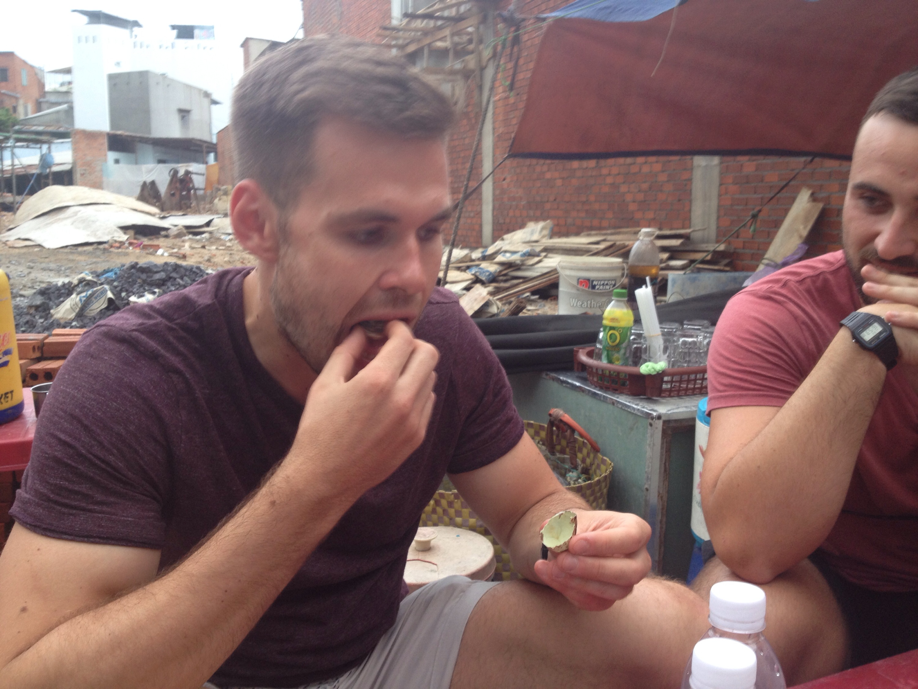 Quickly realising that there isn’t really much to do in the town apart from the beach and nightlife, I meet up with the Hanoi boys and James from London who is staying in the hostel and in the same room as Darren and Tom where we head to the beach for a few drinks grabbing what little sun there is. Then having to head back for the hostels street food tour we spend the next 2 hours walking through the more authentic parts of Nah Trang via the markets stopping off at 8 different places to try all the real Vietamese food and sitting at the smallest table and chairs! Quite funny to see the lads all squeezing onto those! So avoiding any seafood most of the dishes are lovely but the 7th is pretty grim and is quail eggs and fermented duck egg which looks pretty rotten and you can actually see the shape of the duck and start of it growing feathers! So James is the only brave one to try the duck but it didn’t seem to go down too well. The quail egg went down better but I wasn’t game enough to try it! So now all massively full we go back and change to head out stopping to buy a bottle of vodka to get the night started and drink on the roof bar. Then when that runs out head to the next door wave bar for drinking game having to down our drink on an ace so meant we ended up going through quite a few cocktail buckets. Luckily they were buy one get one free which was even better! So leaving there quite hammered, head to the Why not bar for jaeger shots and more drinking staying about an hairy until we leave with another group on a hunt for club, loosing Tom in the process who heads back as so drunk and us wading knee deep through the street rivers after another downpour. After not being able to find the club we end up in a weird little bar drinking til about 2 before braving the even deeper street river by now up to our thighs… Fun and games!!