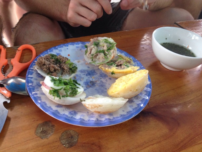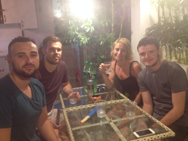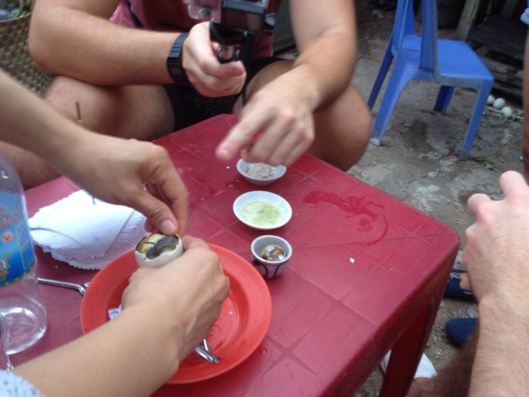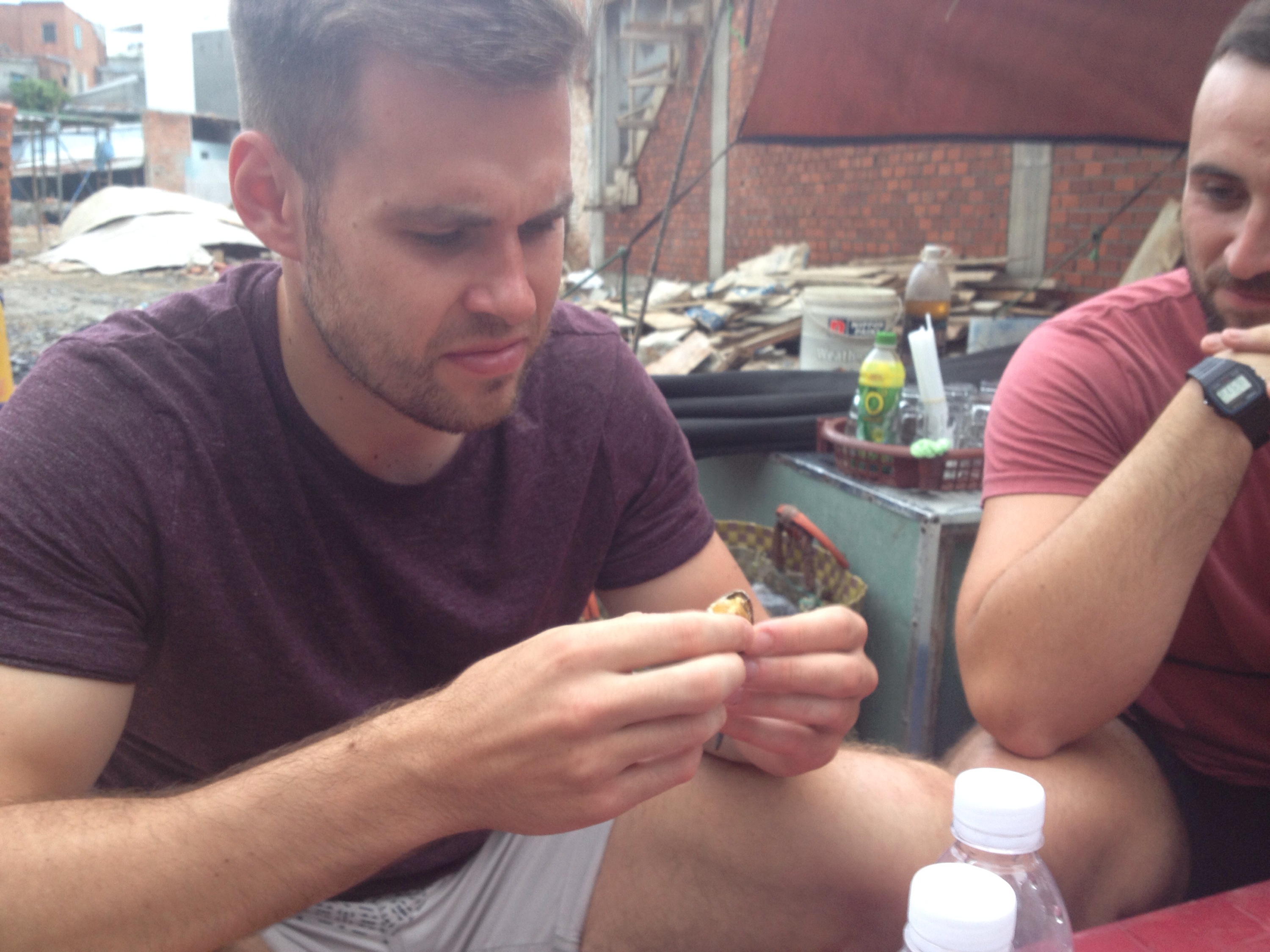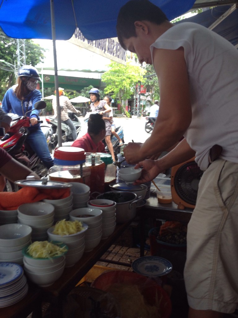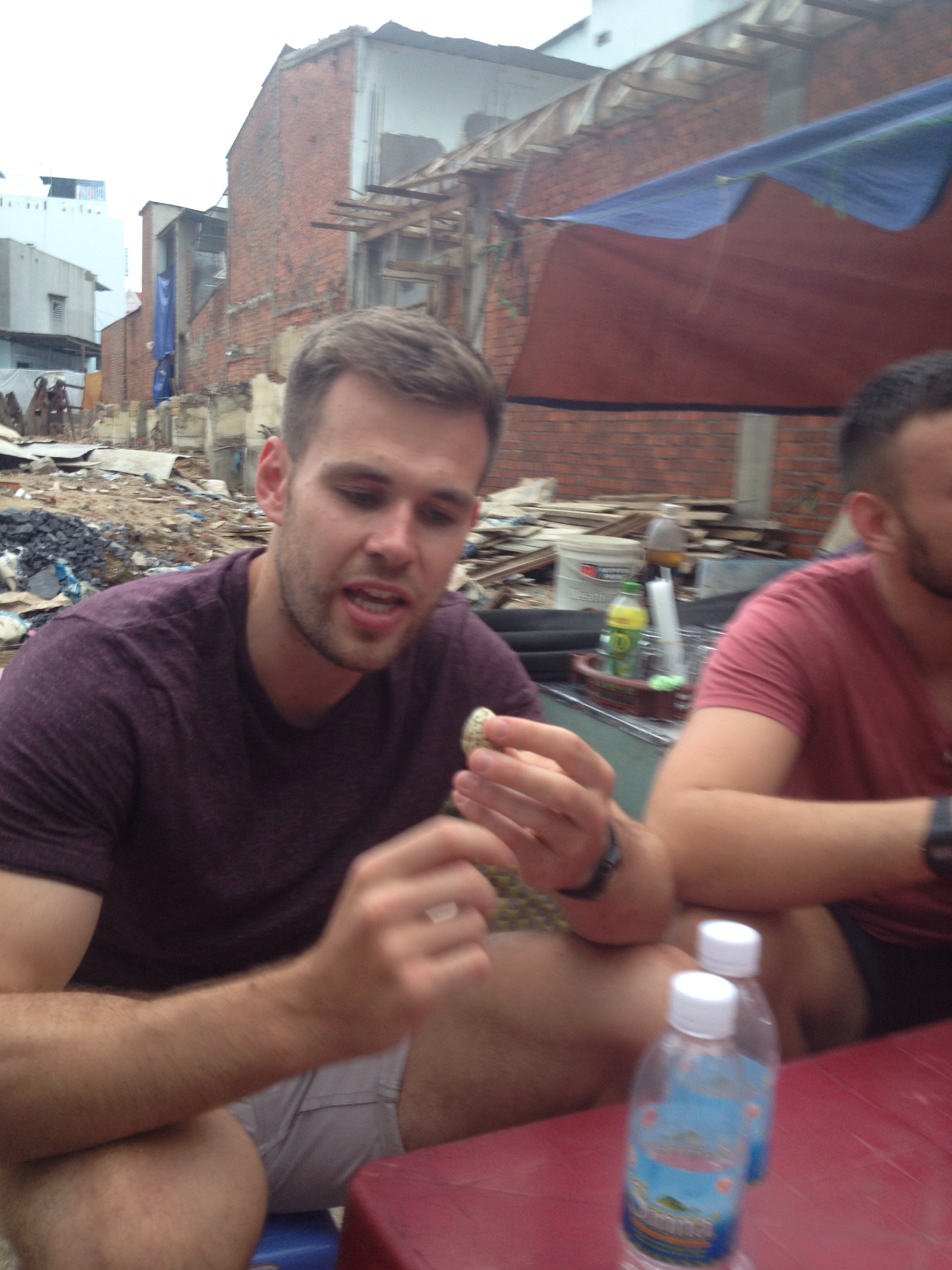 Quickly realising that there isn’t really much to do in the town apart from the beach and nightlife, I meet up with the Hanoi boys and James from London who is staying in the hostel and in the same room as Darren and Tom where we head to the beach for a few drinks grabbing what little sun there is. Then having to head back for the hostels street food tour we spend the next 2 hours walking through the more authentic parts of Nah Trang via the markets stopping off at 8 different places to try all the real Vietamese food and sitting at the smallest table and chairs! Quite funny to see the lads all squeezing onto those! So avoiding any seafood most of the dishes are lovely but the 7th is pretty grim and is quail eggs and fermented duck egg which looks pretty rotten and you can actually see the shape of the duck and start of it growing feathers! So James is the only brave one to try the duck but it didn’t seem to go down too well. The quail egg went down better but I wasn’t game enough to try it! So now all massively full we go back and change to head out stopping to buy a bottle of vodka to get the night started and drink on the roof bar. Then when that runs out head to the next door wave bar for drinking game having to down our drink on an ace so meant we ended up going through quite a few cocktail buckets. Luckily they were buy one get one free which was even better! So leaving there quite hammered, head to the Why not bar for jaeger shots and more drinking staying about an hairy until we leave with another group on a hunt for club, loosing Tom in the process who heads back as so drunk and us wading knee deep through the street rivers after another downpour. After not being able to find the club we end up in a weird little bar drinking til about 2 before braving the even deeper street river by now up to our thighs… Fun and games!!
