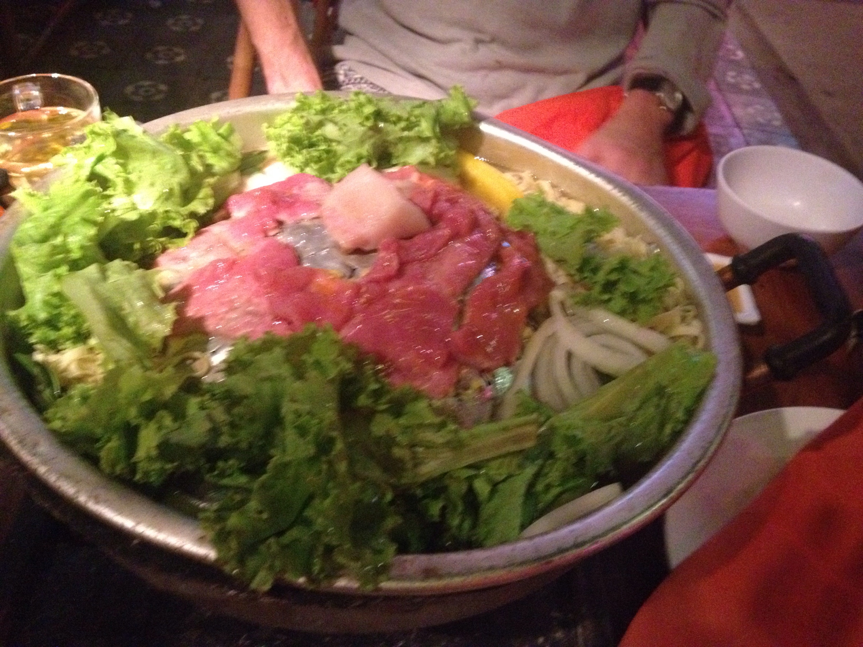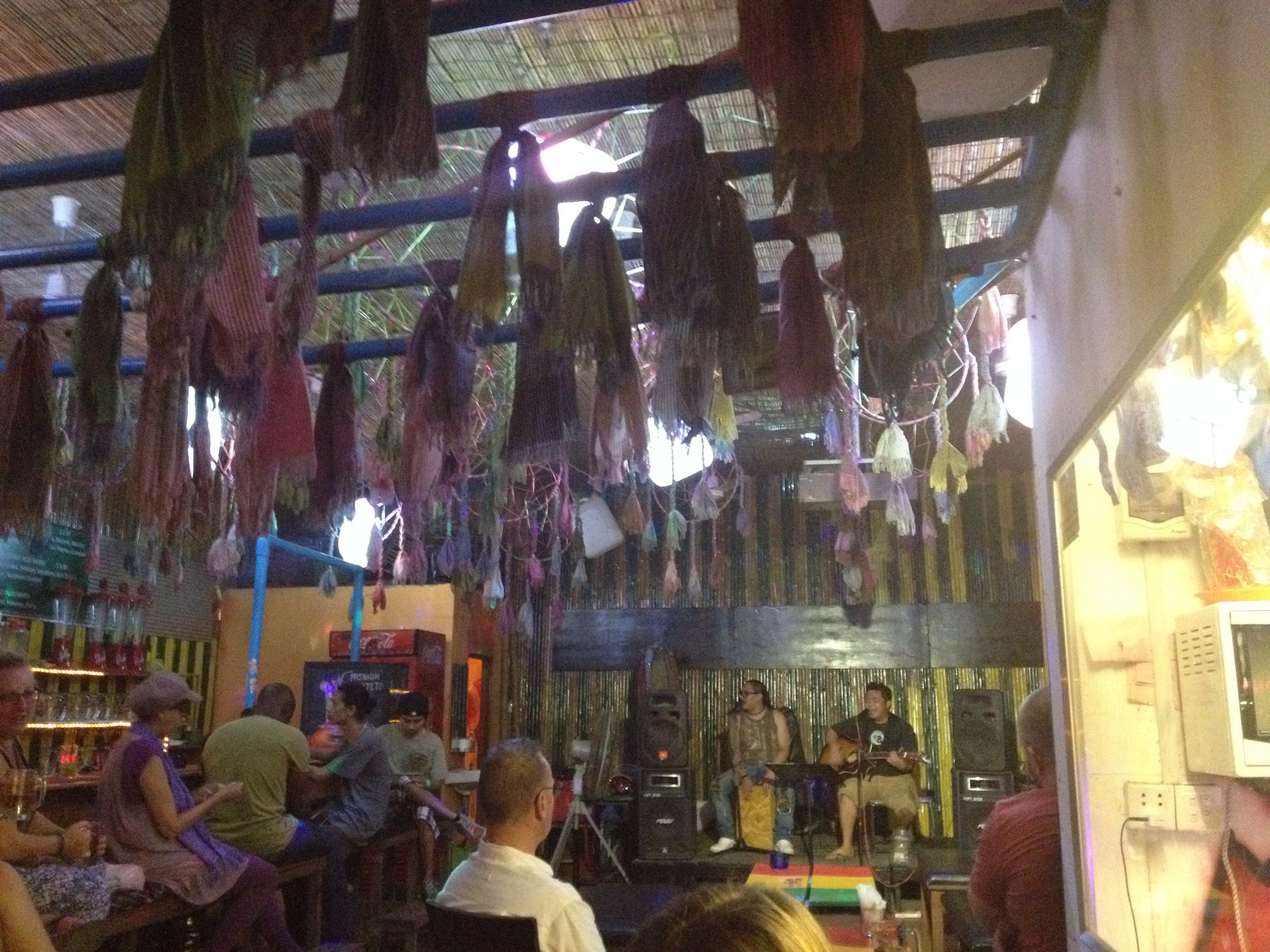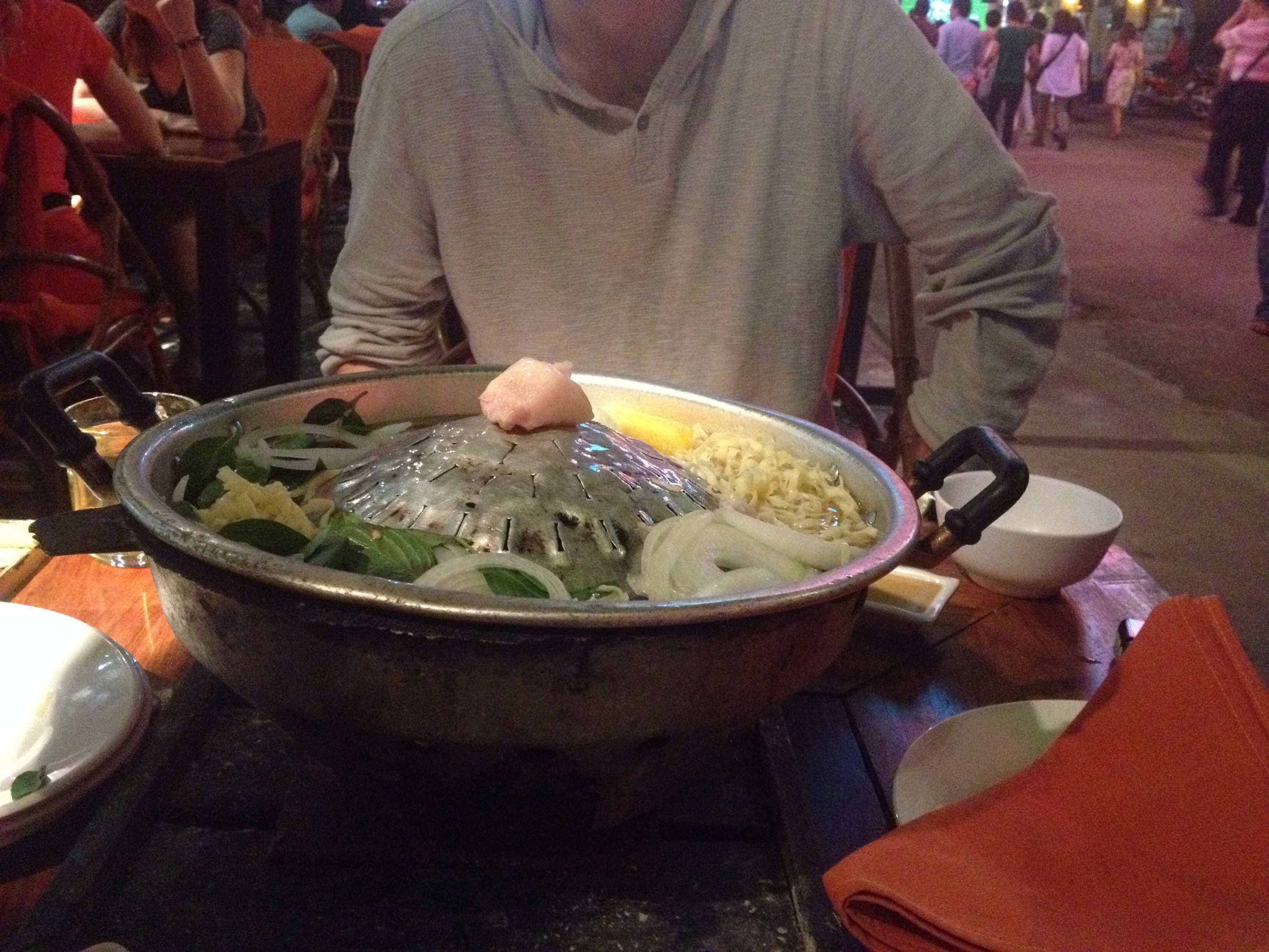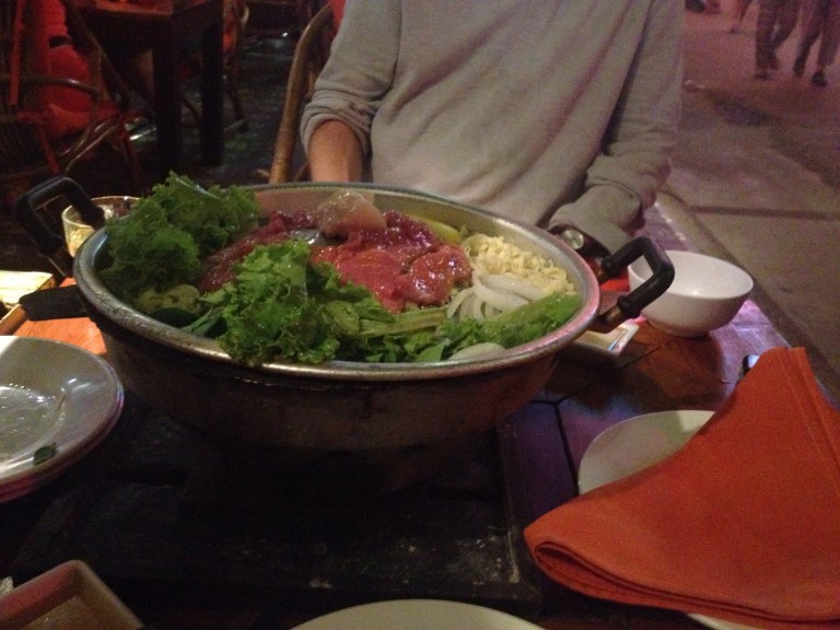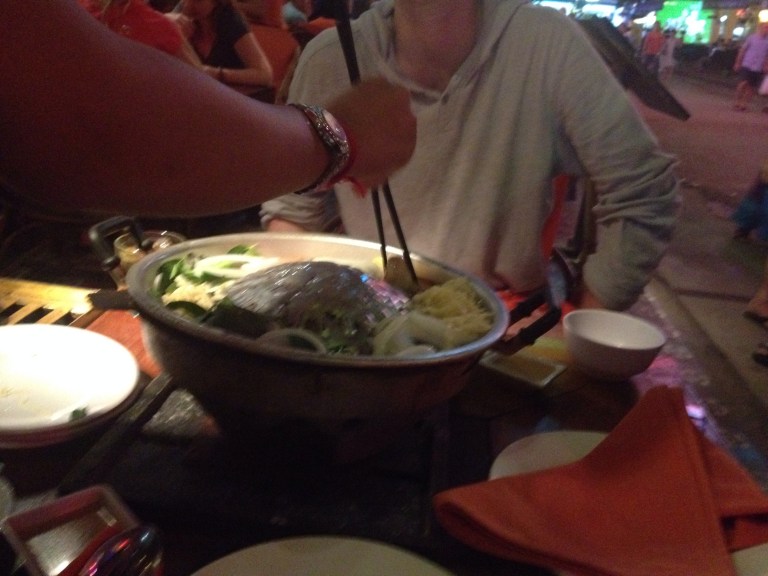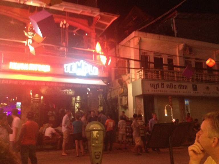 So after a long day at the temples which were amazing I head out with a couple of people from the tour for dinner and have a traditional kymer bbq which is cool as comes out in a big pot with all the meat and veg and noodles on the side which you put along the side and meat on the top to cool it. Very tasty and getting better with the chop sticks too. So they head off and I stay out and bump into Halong bay boys – Scott and Stu and end up staying drinking with them in Angor Wat bar before we head back with few others to their hostel garden villas as it has a pool and 24hour bar. We play volleyball for bit and there are a few other London guys there to chat too so good fun and late night swimming!