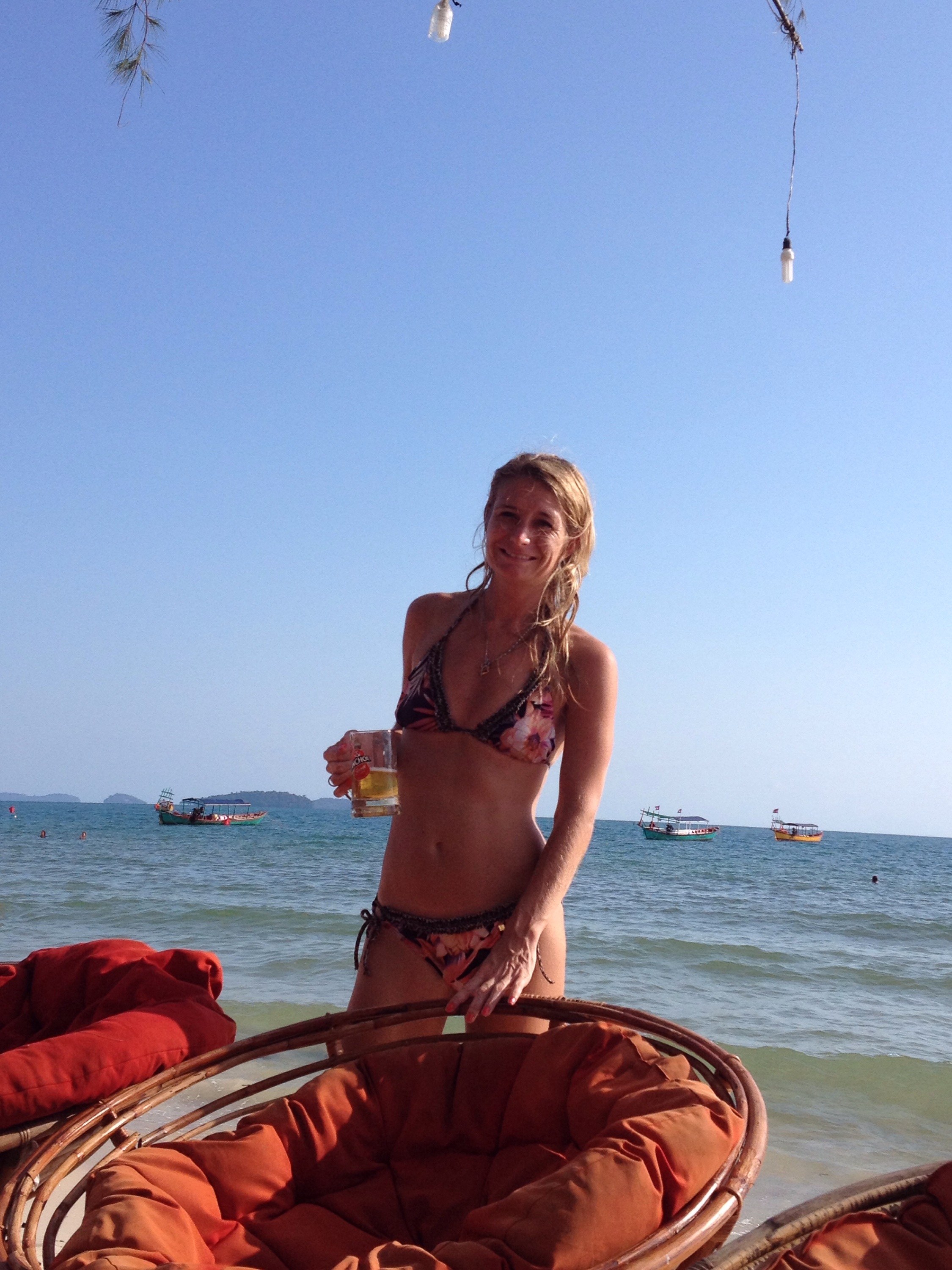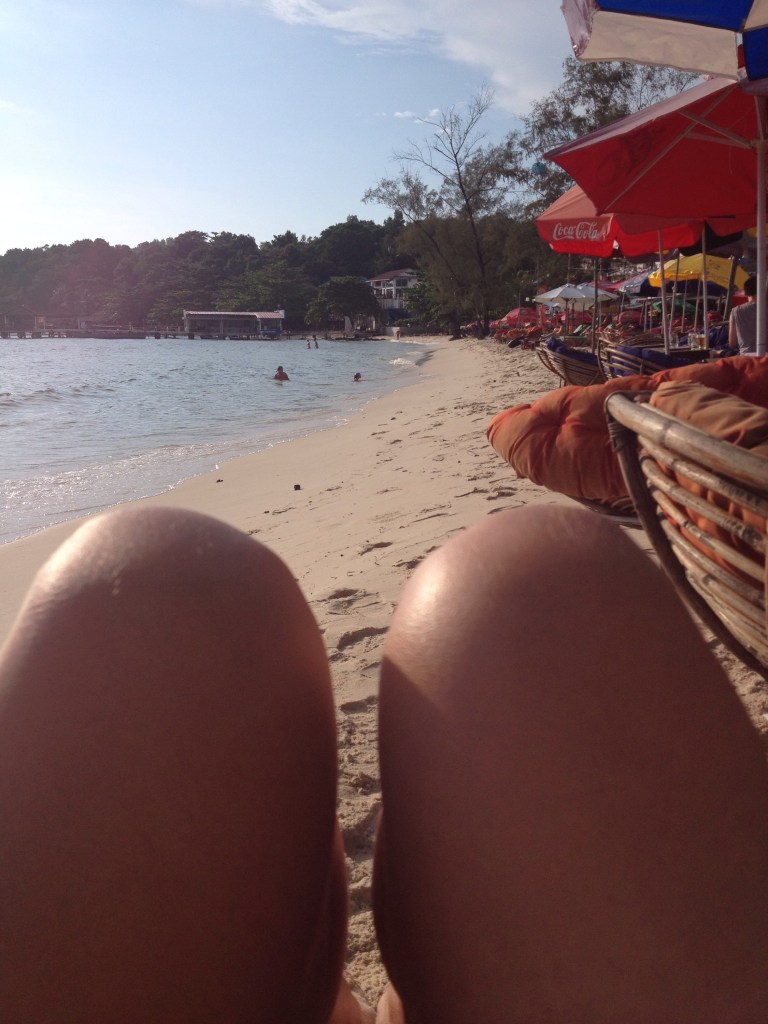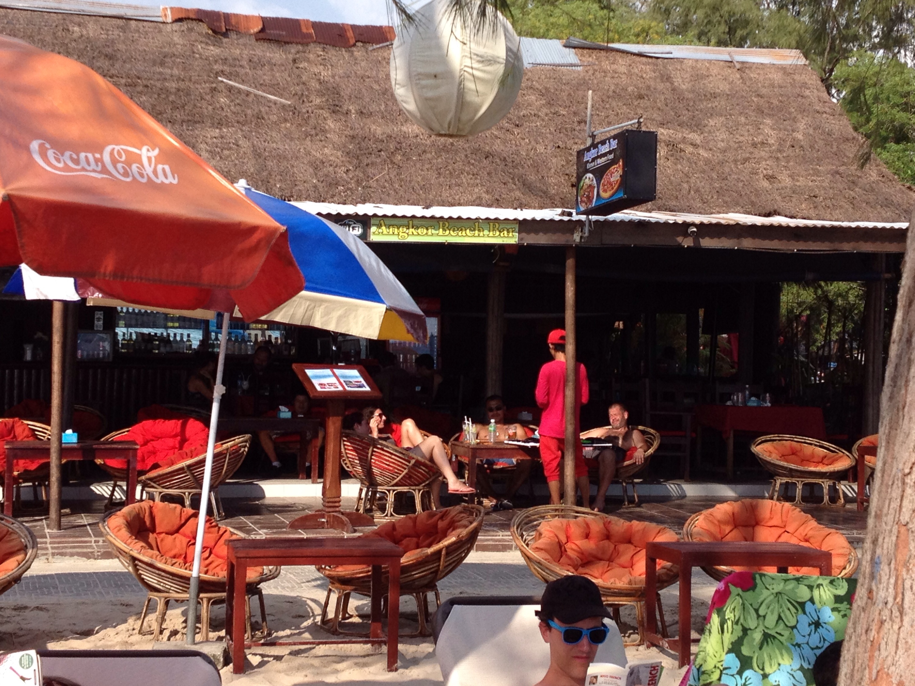 So after another much later than planned night til 5, we have to get up at 6.30am for our bus to Sihnoukville. Going with George and Scott the bus ride for 4 hours isnt the best. Sitting squeezed in at the front with Scott falling asleep on me most of time as out for the count plus me trying not to look at the road ahead and watch how the driver is constantly overtaking so cars in the opposite direction are flying at me. Arrive there about 12.30pm at our hostel One Stop. Think would say its the nicest hostel dorm have stayed as nice tranquil pool and lovely showers which I definately spent too much time in lol. Even free hairdryer so pushed the boat out and straightened my hair just because Ive not had hair up for weeks haha. Spent most of the day chilling by the serendipity beach constantly being hassled for massages which i eventually gave in and got a pedicure lasting ages nearly an hour spent doing foot massage and polish for $7. Also got roped into threading of my arm pits which is a first and more painful than eyebrows so wont be doing that often but its great for backpacking! The beach is nice and quite busy with every bar having outside tables. Loving the sea as so warm although not that clear but still nice to swim in the sea as first time since being away. We stay there for the sunset just chilling in a bar on the beach. At one point we have to duck inside as we get a little storm which was an odd one as the sun was totally shining and sunbathing but raining at the same time. Luckily it doesnt last too long and can head back to get ready for a big night out in town!