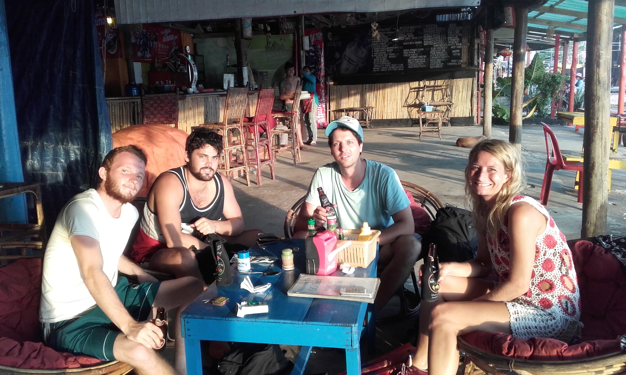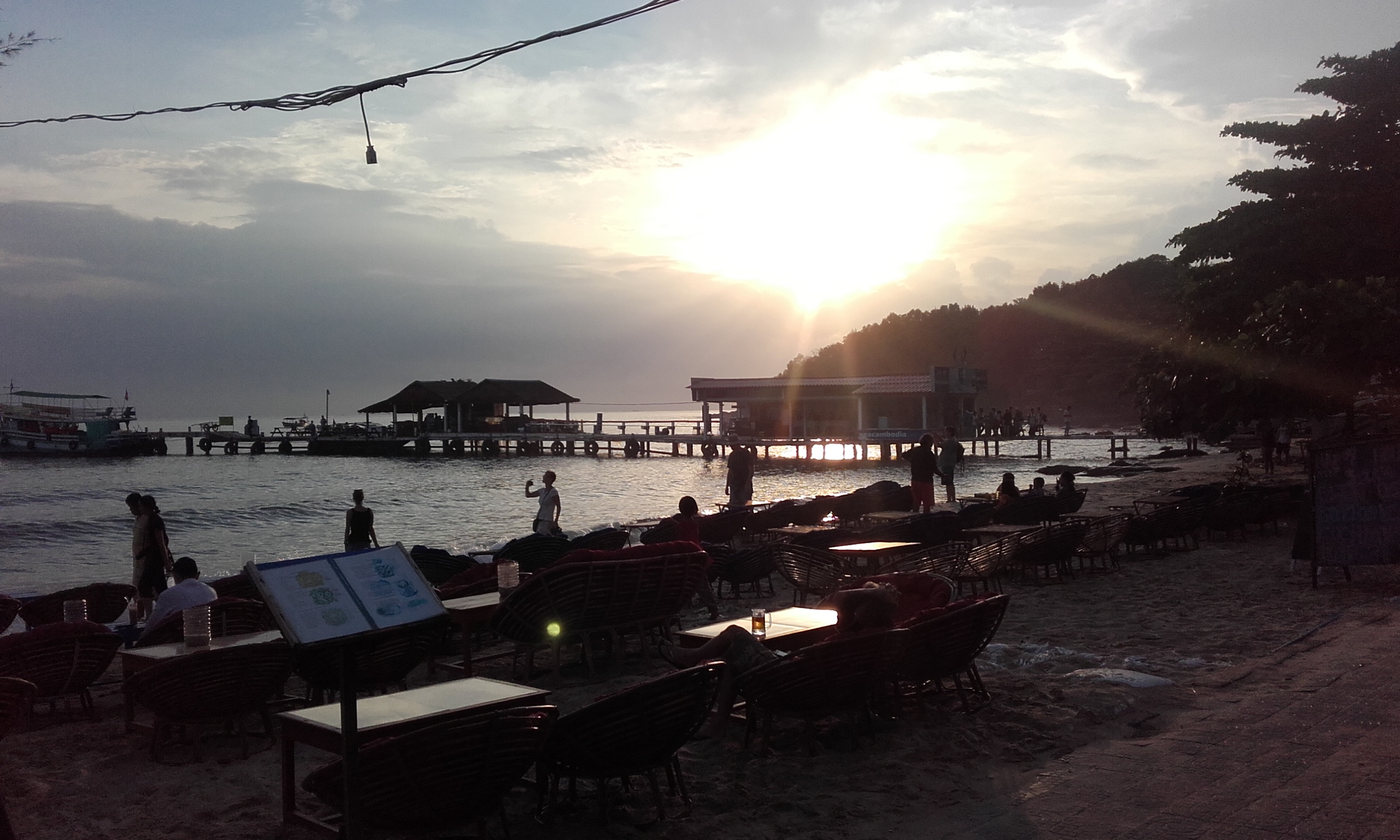 So its a day for farewells with us all firstly having to leave Koh Rong which is always going to be hard but do manage to get a full morning of swimming and hanging around the beach especially as everthing on the island runs on cambodian time – whenever they want so the boat is an hour late. Weather wise it seems a good time to leave as storm comes across half way back and so arriving back in sihnoukville its dark skies and all a bit gloomy looking. So the boys head to a bar to wait for their bus to siem reap as its also farewell to them as they are going Thailand then both home, George to london and Scott to auckland. Only known George 3weeks but def been a great travelling buddy and had some proper laughs and some good dance offs! So I check into One Stop again as really liked it last night and drop off stuff, then head to meet the boys leaving in the middle of a total monsoon downpour so even need to grab a brolly. Luckily the rain passes and manage to see one last sun set as we just chill in the bar and the boys book all the full moon stuff until they need to head off. So I wander back to the hostel to get changed for my final night in Cambodia catching Glen along the way who is handing out leaflets for black and white so will make sure I have a drink with him later. The dorm guys all seem cool and friendly so chat away with them for a bit before they go out and say to meet them later on. I take my time as need to book Singapore hostel plus nothing is lively til 11ish so dont want to drink too much early on as up so early for bus. Another guy in the hostel asks if im heading out and head out togethere going big easy bar first bumping into Tom and Lawrence from the dorm who are with quite a big group. One of them from Nottingham recognises me from mui ne and remembers George so thats cool. And he has to be one of the tallest guys seen here too 6-3 apparently lol. So end up spending most of the night with them although its not a big place so easy to find people if needed. We stay in dolphin bar for a good while, again lots of dancing and also warrior face painting going on. Moving on to next bar with Tom and Lawrence I manage to catch Glen and his french mate who help out with a free drink or 2, although trying to not go to party mad with the early bus in mind at 8am so really shouldn’t however famous last words as its already 1am and my will power isnt great when music is playing.