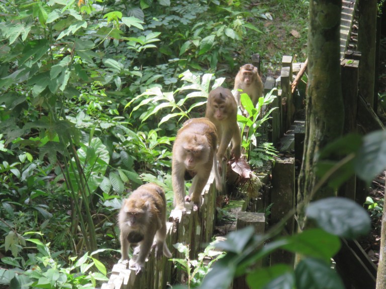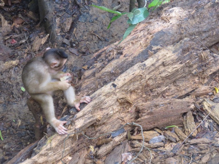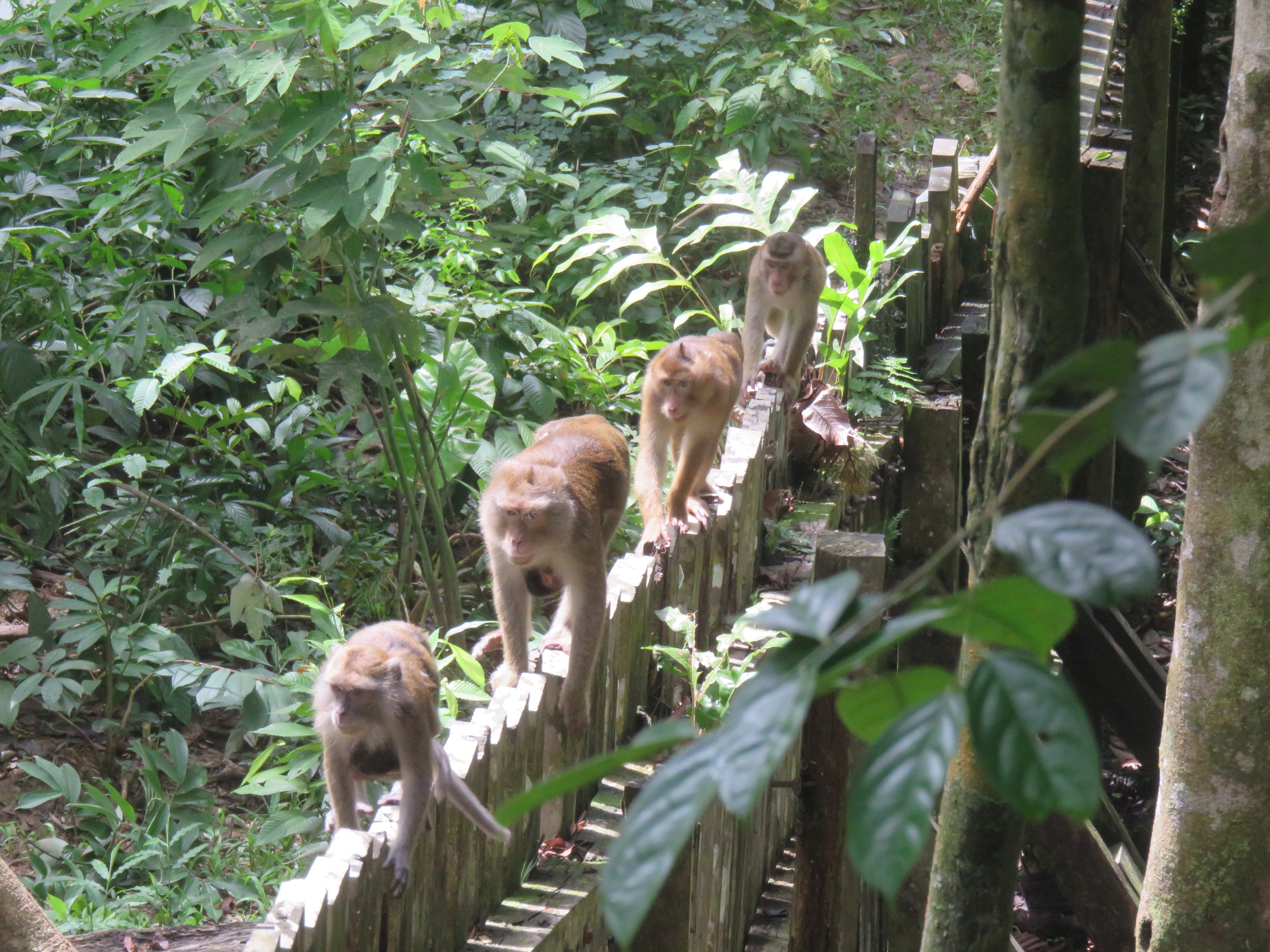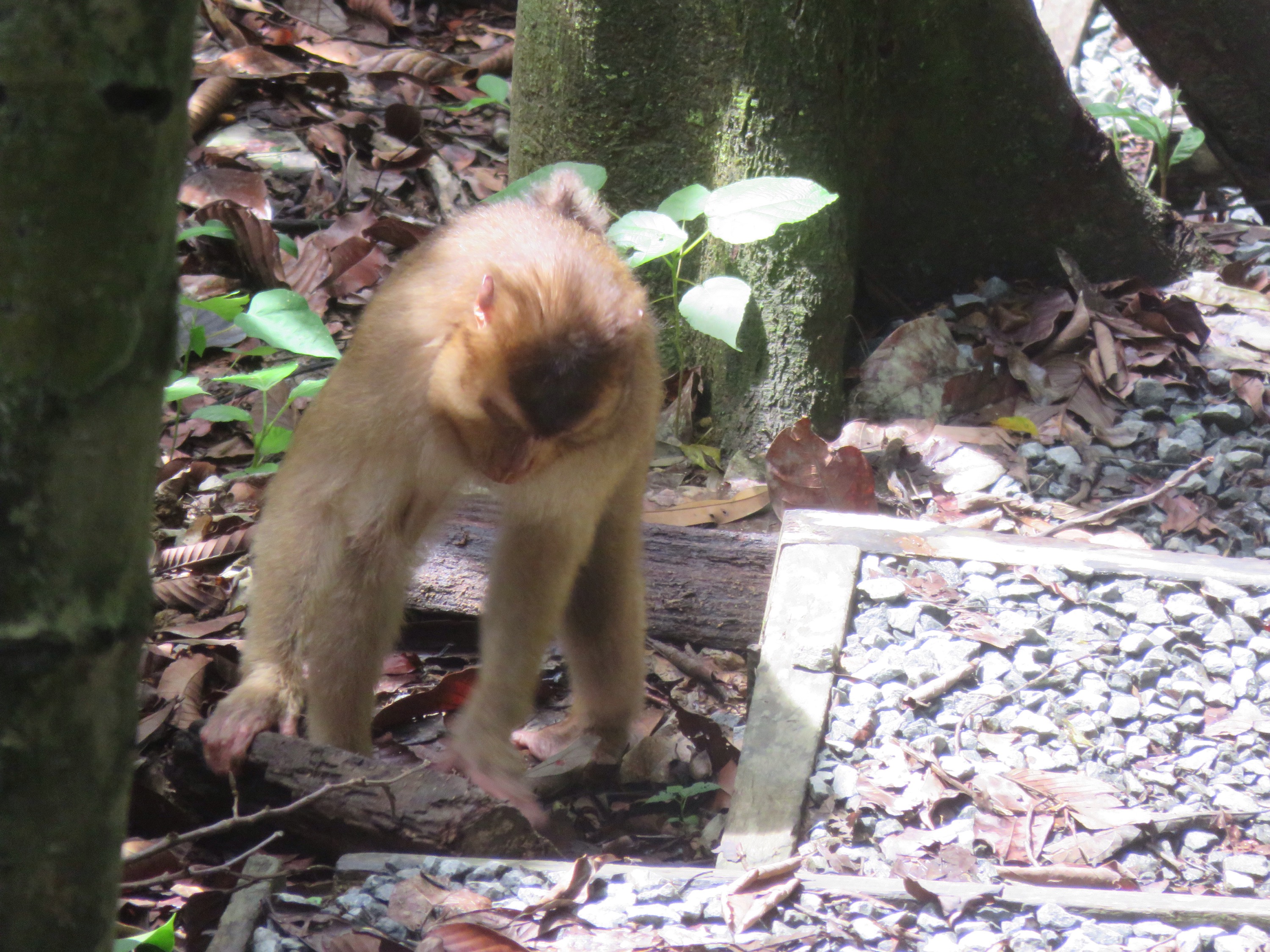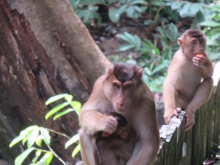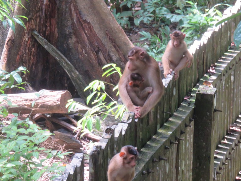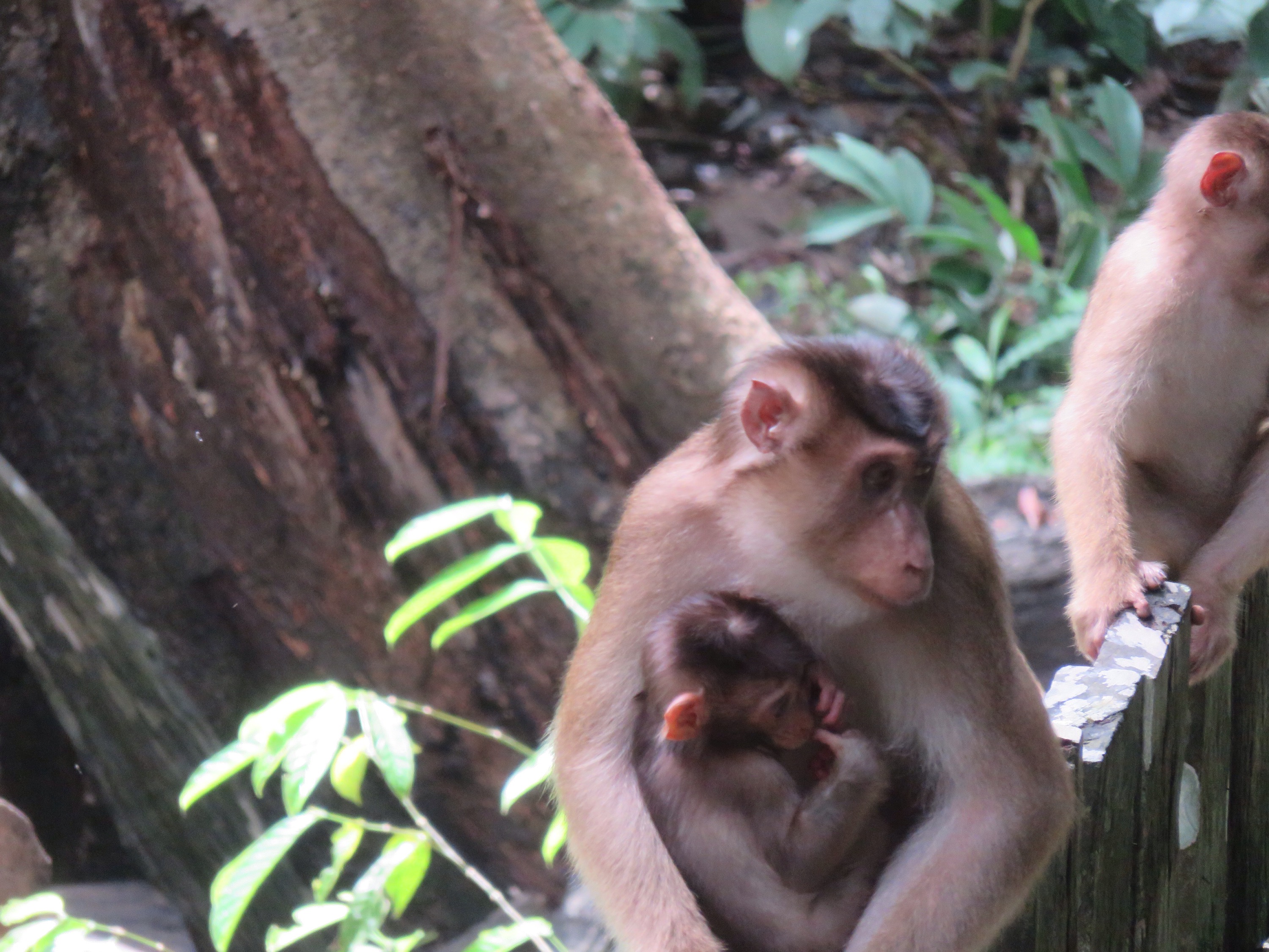 As Im watching the bears and chatting to the guide in the sunbear center called Jeremy – who is so passionate about his job it’s inspiring to see – a big group of monkeys turn up. Strutting their stuff all walking in a line on the fence towards me, they look like they have attitude. The leader of the pack is a pig tail mackalay monkey and the rest behind longtail. Jeremy says the pig tail is the alpha male so very dominant and agressive which you can see. It looks ugly from behind lol. The others are much cuter but look mischievous and there is a mum walking up with her baby under her holding on with its 4 hands and feet which is very cute. Think they are after food from the feeding station but the sunbear place doesnt have set times as they found too much sugar from the fruit is bad for the bears and gives diabetes and they want the bears to be independent and find own food and not have the monkeys steal it as thats what they do best apparently.
