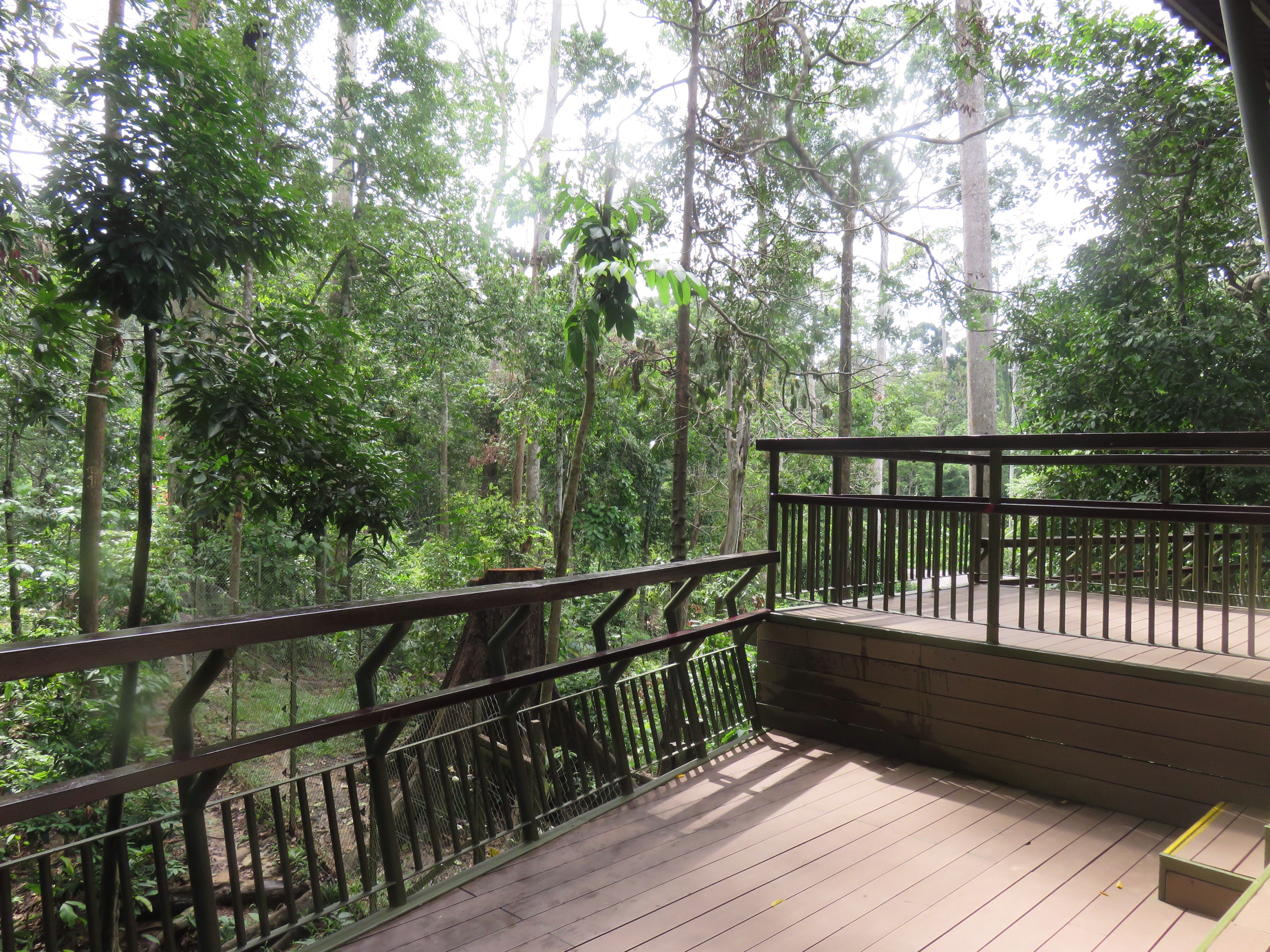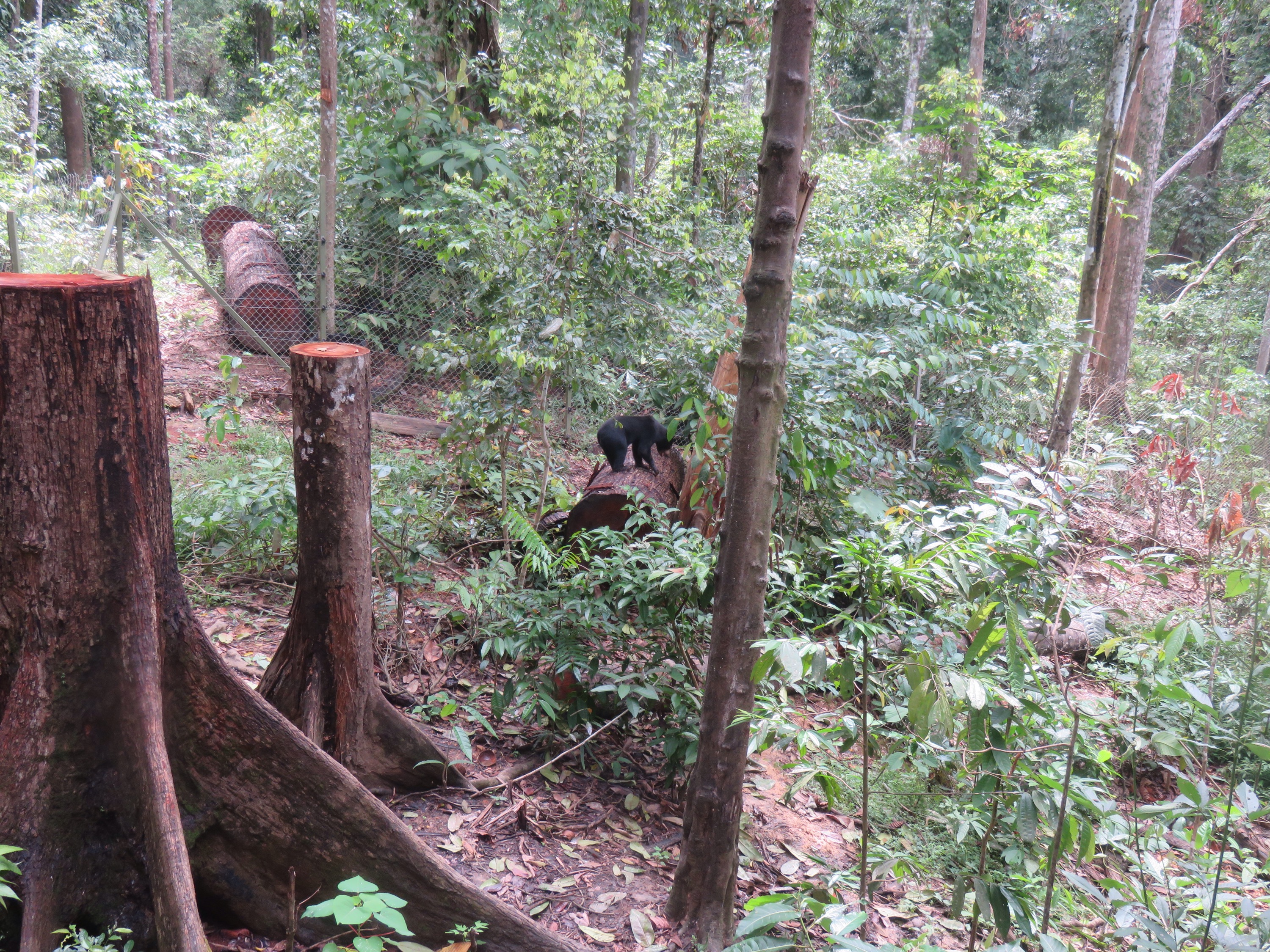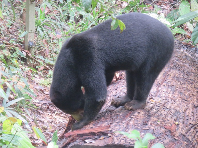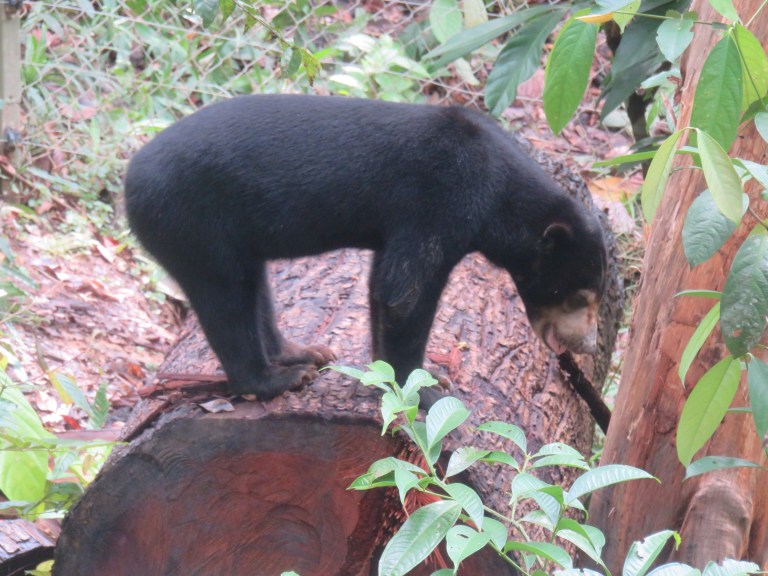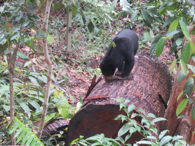 The sunbear center is not as well known and is quite new vs the orangutan rehabilitation. I only just have the cash as didnt bring out a purse as not allowed bags in the orangutan part. Its much smaller and they are in the process of building new viewing platforms and ariel walk way as they have 10 sections in total with only 2 on view to the public. So straight away there are 2 sunbears one trying to cool off by panting and other one climbing the tree super quick and right to the top. Impressive to see and very cute. Got a set of awesome claws too, which will help them. Most of these bears have been rescued from small cages as kept as pets or on the blackmarket as its believed they help with powers for some reason poor little guys and many take years to be confident to go out into the outdoor sections so stay inside the sunbear house instead which is made natural and gives them forage and trees to climb too.