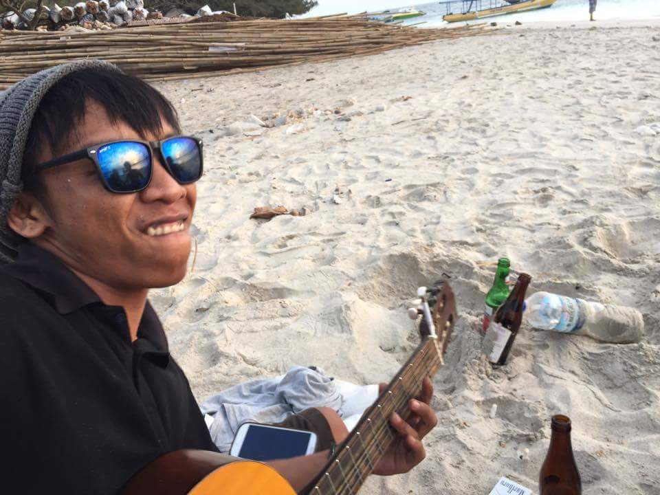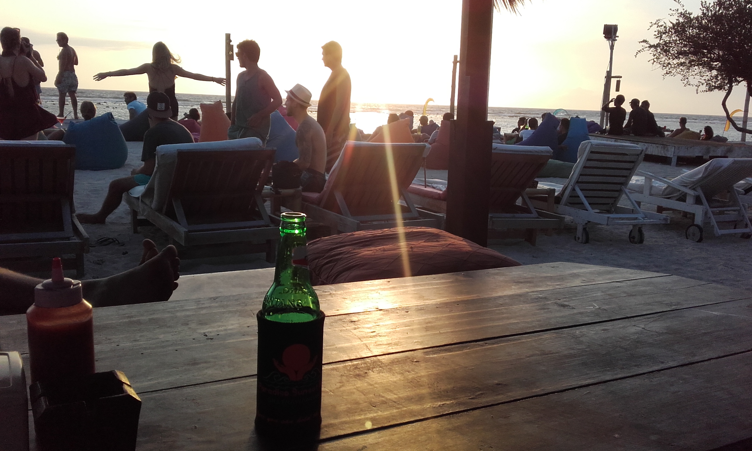 Sharing a room with couple of guys who work in Perth in the mines, Clinton from Gold Coast and Andy from NZ I get chatting to them and they are getting bikes and heading round the island bit to see sunset so head with them. The island is small and can cycle whole thing in hour or so but we just go about 15mins to a really cool bar with total ibiza tunes playing called Paradise Sunset Bar and is meant to be best place on Island to see the sun hit the horizon. Its pretty packed and we get a cool set up with a hut and cuahions watching some of the guys upfront memorized and spaced out watching the sunset which is quite amusing to watch as only on Gili lol. We stay there til about 10ish and cycle back a bit drunk but not too bad and head to the hostel bar Lava which is quite busy and the local workers there are strutting their breakdance moves – impressive but guess they have the time to practice. The night tonight for Gili as it rotates every night is Jiggy Jigs which is super lively and get bit of a group together and before now it all sitting after it shuts outside the gilimart listening to a few of the locals play guitar and sing away. As more people walk home they stop off and join in with a few wanting to head to the beach to watch the sunset. Manage to stay up with the help of few bintang and redbulls and the sunset is def worth waiting for and very amusing us all in a circle jamming away. Very Gili style!