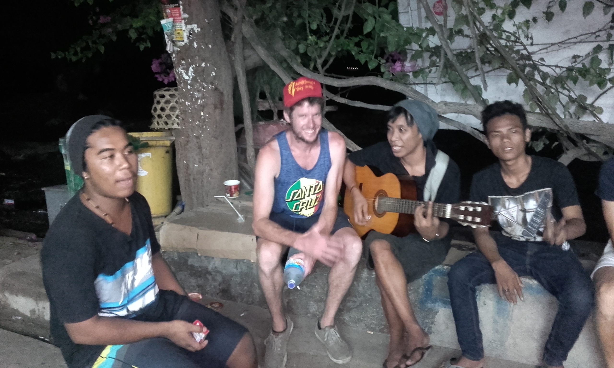 As the local lads on the guitar and singing have been such a fun part of Gili we have to have a farewell session as nice friendly guys always saying hello as I pass by on the bike! So on the way back in the usual spot outside the Gili Mart there is already a few quite merry people there, with an English guy in particular who is totally getting involved dancing and singing and has a good voice – quite high pitched so maybe done chrior singing or something! They play the only few songs they know which are all good like Be Happy, Bob Marley, Wonderwall, U2 so all good fun. Another request for Californication comes in from a Finish guy – popular there – but doesn’t know the words and either do the local boys so bit of a non starter. So finish up on Wonderwall which is definitely the easiest to get people involved with. Mission if I come back to Gili is to teach them a few new songs haha.