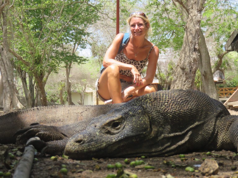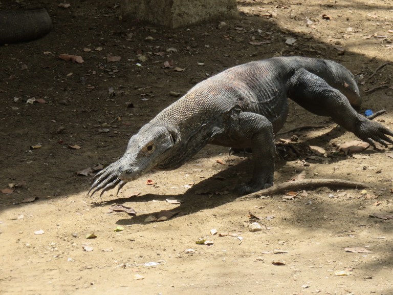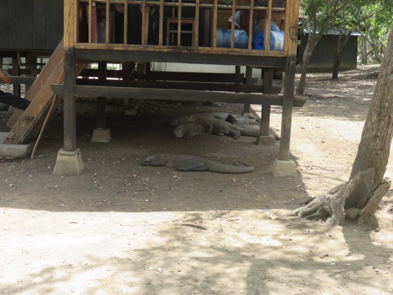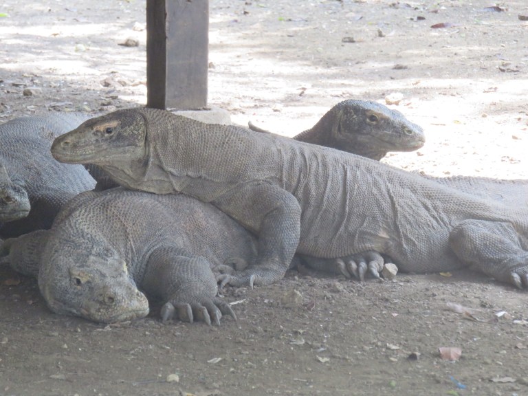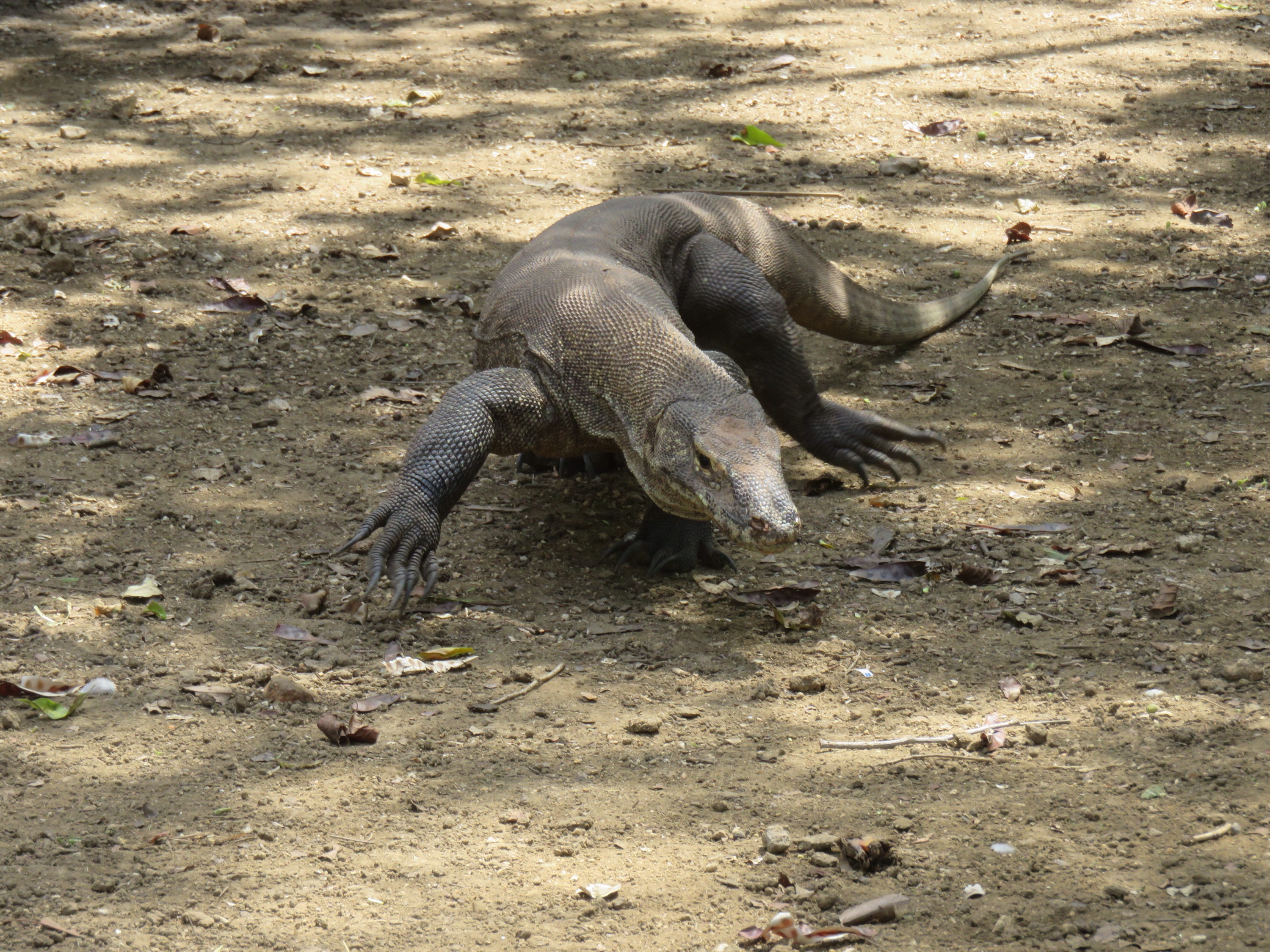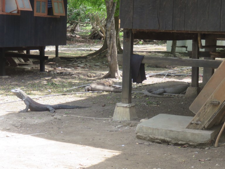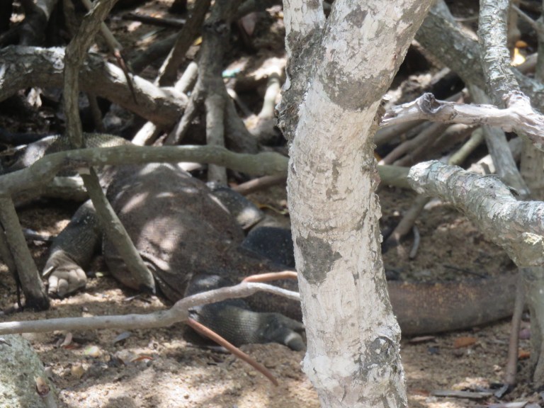 So as a group we decide to do the medium hike of hour half as the ranger says good to see the dragons but island us huge and just 2000 on the island. First stop is the kitchens where about 7 hang out (we think cause they are fed!) and they are a mix of super large males and some smaller females. They look so lazy slumped over each other and some asleep but guess thats how they get their food as are so well camouflaged and still when animals go by they bite and the poison gets them. We see the leftovers of a buffolo hoof which wasn’t digested after some killed that waiting a week for the poison to work vs on a deer taking 2 hours. The guide also tells us they eat their babies as are cannibals – nice breed!! Along the hike we don’t see much in the wild with only a baby one hidden in the bush next to some momkeys and a large one on the way out that looked like a branch as so well camaflaged. Bit frustrating we don’t see more and would have preferred to do the longer hike to see them but as I learnt from Borneo you can’t rush nature haha. Once we are back from the walk a few of us want to see the kitchen again as thats where most are and interesting as soon as the guide has done their time they stop working and don’t accompany us as we are not meant to be on our own or within 5m as they have sticks to push them away if they get close as apparently they have attacked humuns. Eventually the guide comes over and we can get close enough to take some cool pics of us behind one of the larger dragons, even looking a bit super imposed!