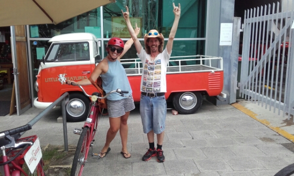 As we can’t do much shopping we head to Little Creatures for a drink as it is also a brewery as well as being known for being lively. It’s a cool place with urban vibe, reminds me of Shoreditch with the brewery tanks in the background. Bex says the food isnt great so we decide to try a beach further up. As we are leaving we notice there are a load of little creature bikes so expecting them to be expensive to rent, we are surprised when they are free. Just need to give ID and credut card to the whacky man serving, who is actually quite entertaining at the same time and we are off!! Ready to go…