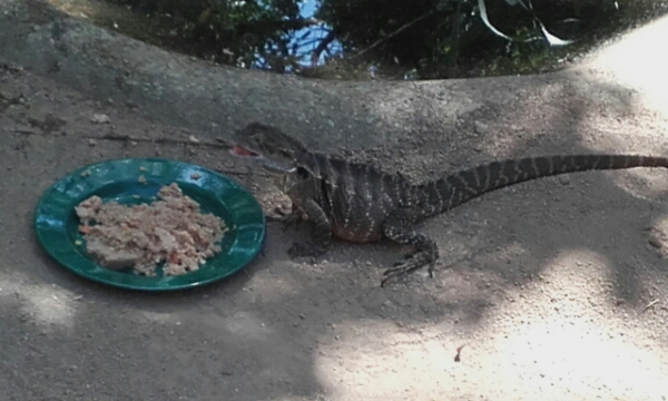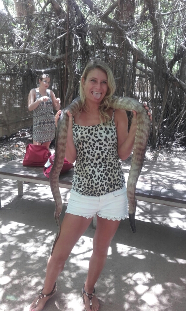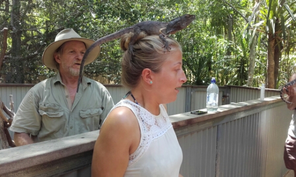 Next part is holding all the lizards – bearded dragons and some other weird and heavy one. He puts the lizard called Fred on our heads, starting with a girl who he teases by pouring water down her back saying it weed on her and then her friends join in the prank telling her its really yellow on her top and smells. She doesn’t look impressed so it is quite funny. He feeds the lizard some sort of meat too and there is Echidna which I’ve never seen before and is one of only two mammals that can lsy eggs along with Platypus. Cute, but hiding from the heat in a hole it’s dug as it’s so humid and hot so exactly what I want to be doing.