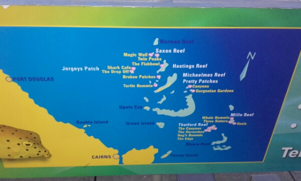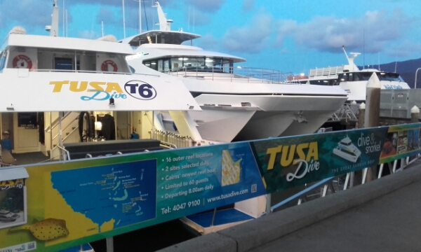 Managing to make the boat all Ok, I head to the Marina where the Tusa boat leaves at 8am and first impressions are the crew and boat are nice, not too big either. The weather is a bit grey, but as you go out to the outer reef the weather is always better (away from the mountains of Cairns). So doing an Intro Dive to build up my confidence more, my guide is Matt and we are in a group of four. He is good and takes us through the location area and what we will need to do, which al seems quite relaxed while we enjoy cake and coffee on the deck.