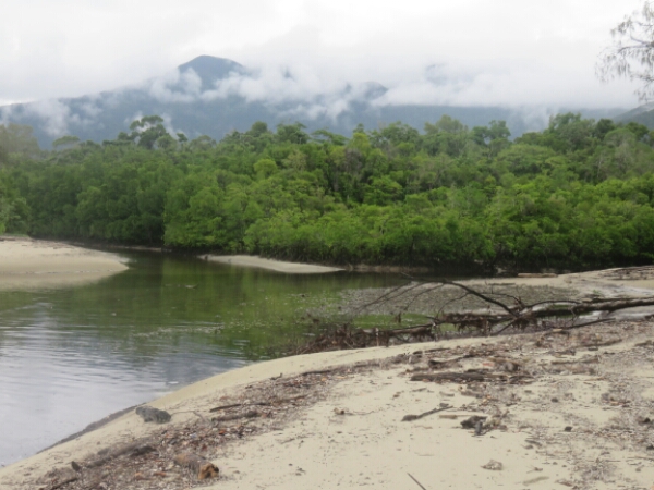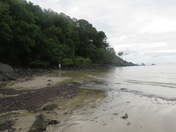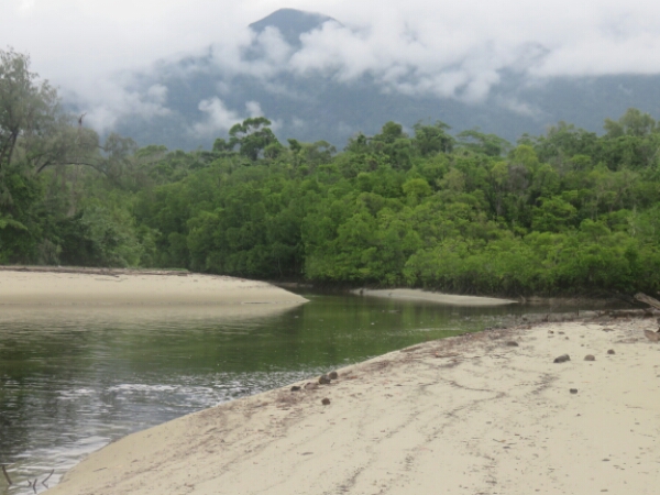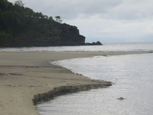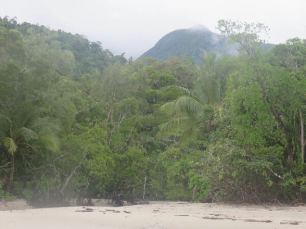 The beach on the other side is totally worth the walk and very beautiful to see, especially with the backdrop of the lush green forest and mountains, being hovered by low clouds that just looks like mist. As we walk along there is a lady sitting on a rock, chatting away into her phone which looks very random and out of place. It must be the only spot where there is phone signal. As we explore the area and walk along, Joe notices a shark’s fin swimming along really close t the shore probably only 1m away. It looks a bit like a black tip reef shark, which aren’t dangerous as far as I’m away as that is what we see in the barrier reef when scuba diving. Already a bit jumpy from the possible crocs and ur path being blocked by a big river/sea that means we would have to get in the water, but don’t dare to do so. So we decide to head back and try the lookout, which isn’t too far.