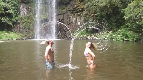 Linzi warns us that these falls are the coldest of the day and since the weather is pretty wet anyway, it’s not the ideal place to go. The falls are super beautiful and it’s refreshing swimming across and under the falls, which are powerful but not as strong coming down as the one in Lombok went to. Linzi gets us all together to each do the hair flick pose and after a few takes I manage to get a good pic and then with Chris have a go doing the flick together to make a love heart and we pretty much nail it! Good fun. There are 4 irish and scottish girls together travelling and they have a go doing synchronised hair flicks too, although takes a few takes to get all their timing right, but they manage it haha.