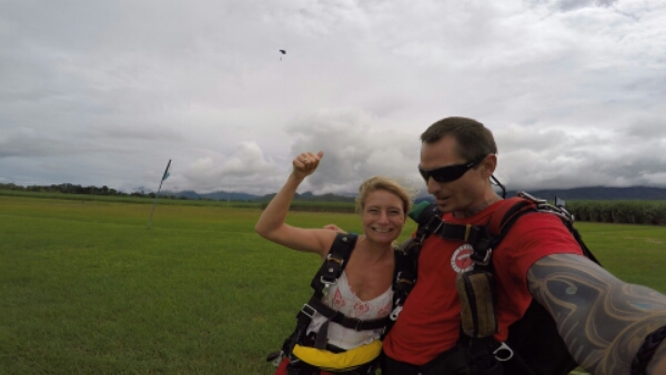 Once out of the plane, again it doesn’t feel scary being so high and falling as the ground never gets closer and the force of the wind keeps pushing you up so just feel like your floating. A very free feeling, probably why they call it free falling! That lasts only about 10seconds or so (maybe longer), but hard to tell but long enough for him to chat to me and we do a few more video shots to try and capture the moment. When the parachute opens, that made me jump a bit as it is suddenly a big jolt upwards and then you slow down so much. The speed in a lot different and here you can actually take a lot of it in and the view. This is where having the amazing views really comes into play and whilst it was nice flying over the barrier reef it would have been nice I think landing onto a beach and falling slowly over the ocean, as the view for Cairns is mostly grass and fields reminding me a little of England, but still nice to see he tableland and cape tribulation mountains in the distance.