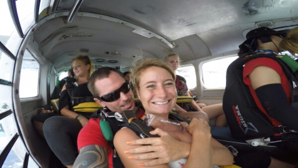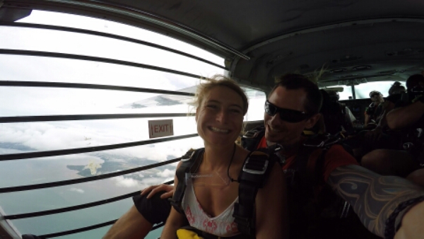 We are in the plane for about 15minutes first and it’s nice going over the barrier reef and seeing the contrast of the forest and mountains. It is funny that despite being scared of heights, being this high really doesn’t feel high or even real so you don’t get that same vertigo feeling. Once we get close, he tells me to backup against him so he can attach all the parachute harnesses and make sure everything was attached. We do a last few video shots and then he opens the door and swings us around. I have to make sure my feet are tucked under the plane, as that helps them being in the right position for the freefall. Then its 1,2,3 and jump….