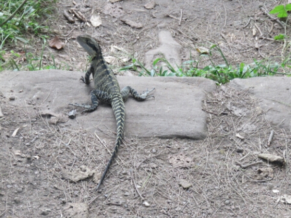 The rest of the walk is through the bush and we see a few lizards along the way and occasionally one colourful flower amongst the brown and green as it is very dry looking.