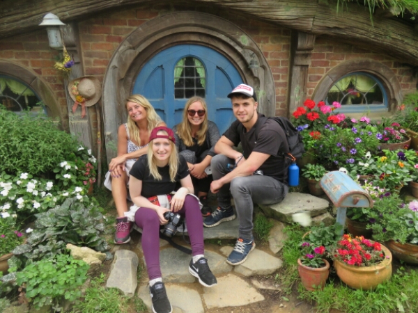 We end up staying about 2 hours for the tour as it’s very busy. There is another group always on our tail as our group is so big and we take a lot of pictures it seems. It would have been nice to stay longer as the last part of the trip is a drink in the green dragon, which is so cool inside looking like a cosy english pub with a fire, leather seats and books. In one room there is flute music playing that totally transports you to the Shire. All very relaxing drinking the cider included, which they brew too and you can also get food there like ploughmans and soups that remind me of English pubs. Overall a good trip and pleased to have seen it, now making me keen to rewatch the films. We stay there just for 15mins and it’s nice group there hanging out with Sweden Ida, the english couple joe and anna and the welsh lads Harry and Alex.