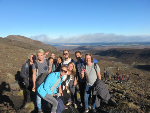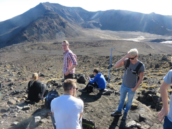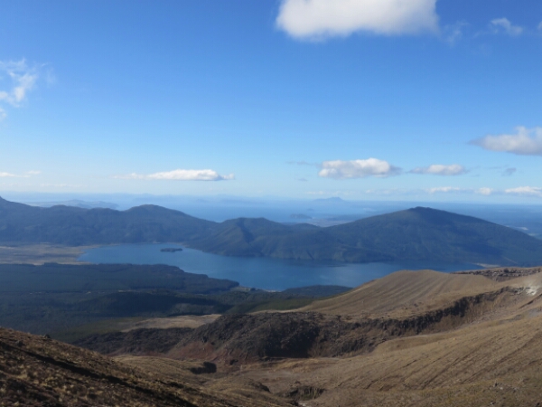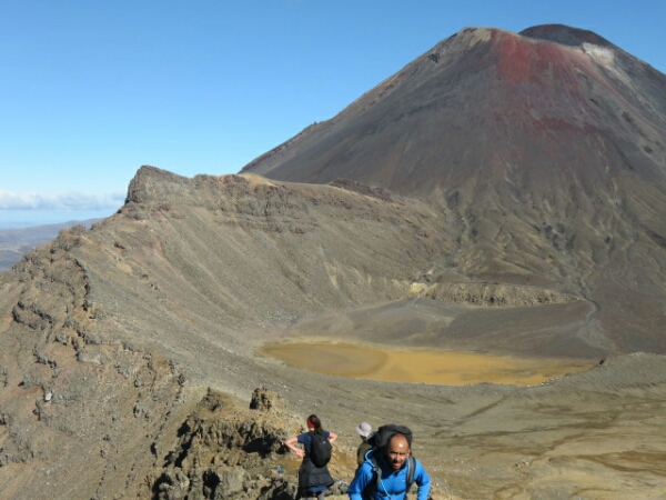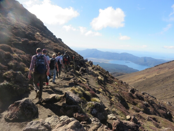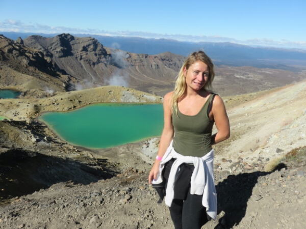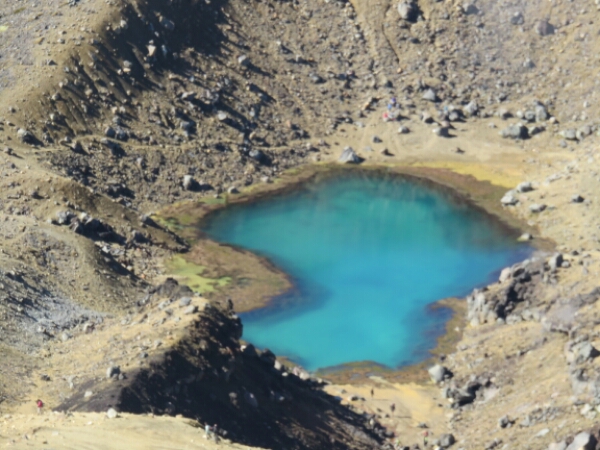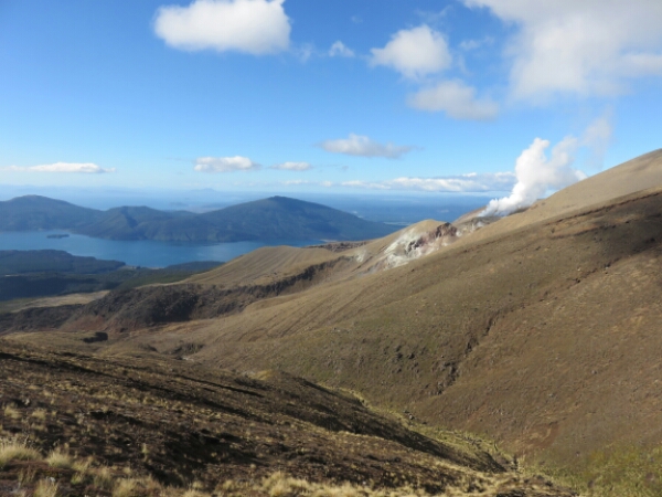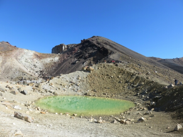 So down and safe on flat ground it is the nicest feeling. Meeting up with the group we sit and eat rest of our lunch and just looking at it what we just climbed it seems surreal that we all just came from the top of it (which you can’t even see properly it’s so high). The next part of the walk is easy and flat and nice break before we have to do some climbing again. Not as steep and tough as Mount Doon, but doing it straight after doesn’t help. There are some ropes on this part you can use to help pull yourself up so that helps and it’s just a few frequent rest stops needed for this. The views are amazing again and seeing Mount Doom from afar along with the side of the red crater is really cool. The colours are amazing when you get further along the Red Crater and in the distance can see the emerald crater pools – fluorescent type water that really smells of sulphur, but provide great pictures. The walk down to them is similar to Mount Doon sliding down the gravel, just nowhere as hard or long. After this there is only one last smallish climb before the rest of the walk being downhill all the way through the Alpine areas. We pass a few other active volcanoes with smoke coming out and it’s a nice walk along the edge as can see the huge lake in the distance and the miles of surrounding Alpine land with the path continuing down as a zig zag for ages. This section of the walk in itself takes 2 hours and the end stop is where the toilets are, as there have been none for the past 5 hours. It is really peaceful walking through this part and the sunny clear day makes it so much better for the views – very lucky considering the previous day was cancelled and day before that got stopped half way.