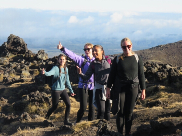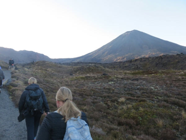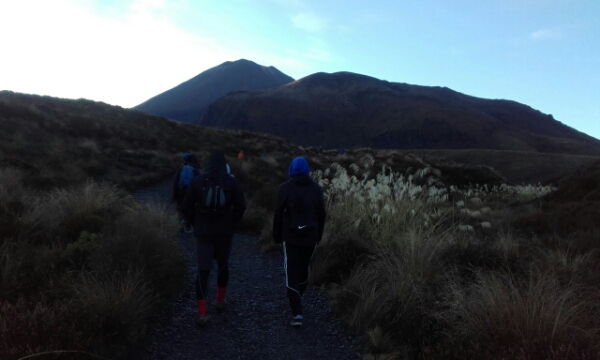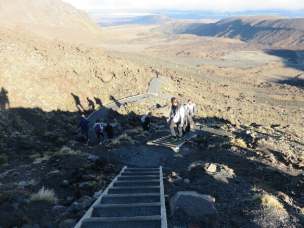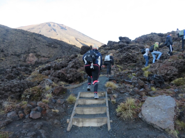 Today is the Tongariro Crossing After our nice chilled night it isn’t too hard to wake up at 4.30am to get ready for the crossing pick up, although there are handful of people who don’t make the bus and have to get the later one, which means they probably won’t be able to do the extra walk to Mount Doom. The drive is about 2 hours and mostly everyone sleeps as its dark. Once we are there the sun is just rising and it looks pretty spectacular coming up over the mountains, which all look beautiful and high. With the whole bus doing the trip, it’s a really nice group to do the walk with and for the first hour it’s an easy walk just flat right up to the part that is a challenge called the devil’s staircase.