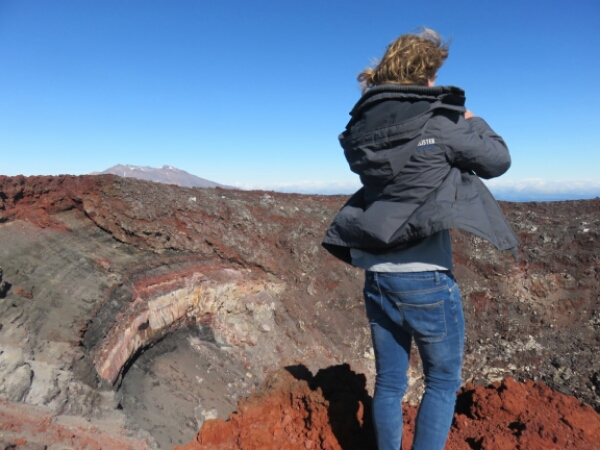 So eventually getting to the top, the last in the group of the boys and the 2 Swedish girls the view is breathtaking and actually can’t believe am up the top of a volcano. The crater just behind me (which I struggle to turn and face as it is so narrow) is really cool with the colours and rock formations. You can walk along the top of the crater, but it’s too narrow for me, so I just sit and enjoy my lunch taking in the views with the group.