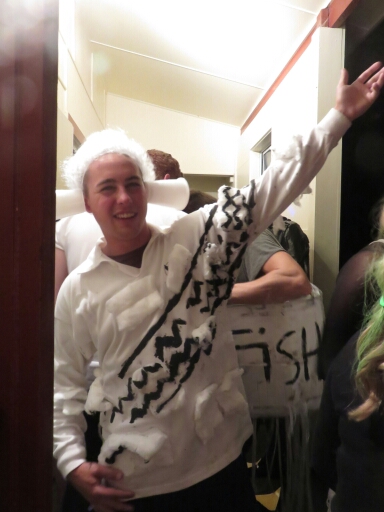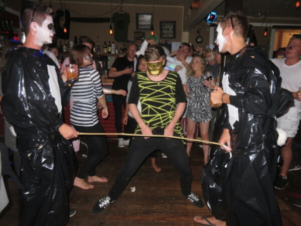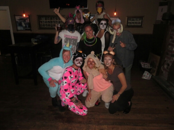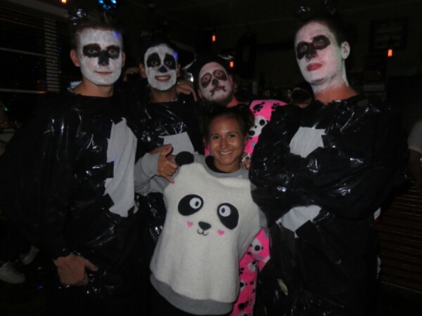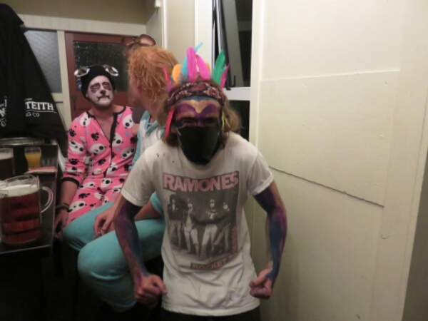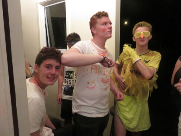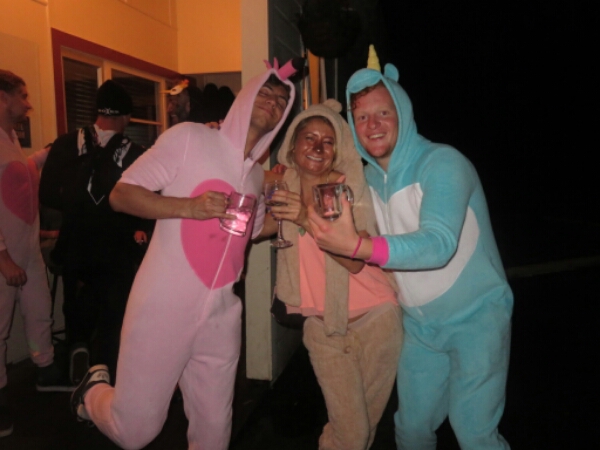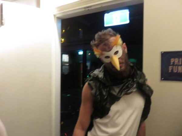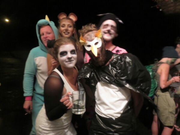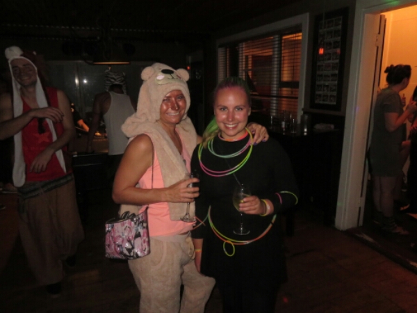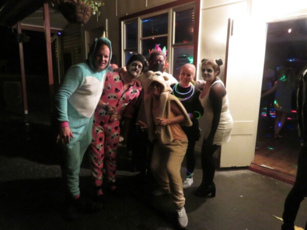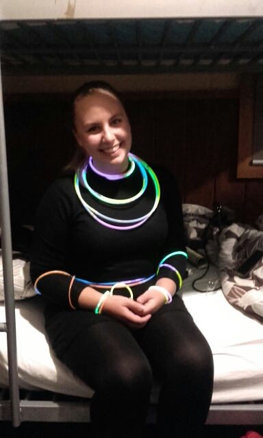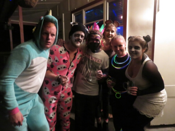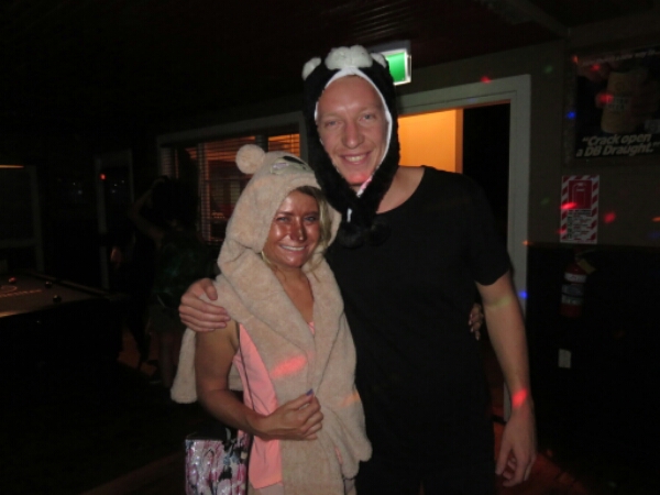 By the time finish the necklace, it’s time for the roast which is pork with cracking and tastes so good as not had pork for ages and loving the potatoes. It’s a big portion and can get more if want, so seems good value as costs $50 (£25) for the room, the all can eat roast dinner and breakfast, which is pancakes and bacon. Straight after dinner we all need to get ready for the party and the guys need to make their outfits using all sorts from black bin bags, card, feathers, toilet rolls and facepaints. Ida goes as a glowworm covering herself in glowsticks, Alex goes as a colourful bird, Harry and Chris in onesies being a Unicorn and a flamingo, Billy goes as Penguin, Mads as an elephant, Janich as a owl, Essie as a monkey and Charlotte as a panda. It is good fun in the room all getting ready and everyone is up for a big fun night. As mine is a fleecy bear pyjama set it is really easy to get ready for, with just the addition of covering my face with brown eye shadow.