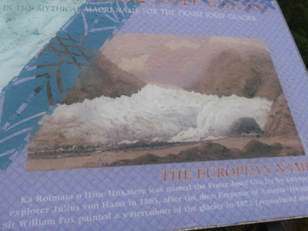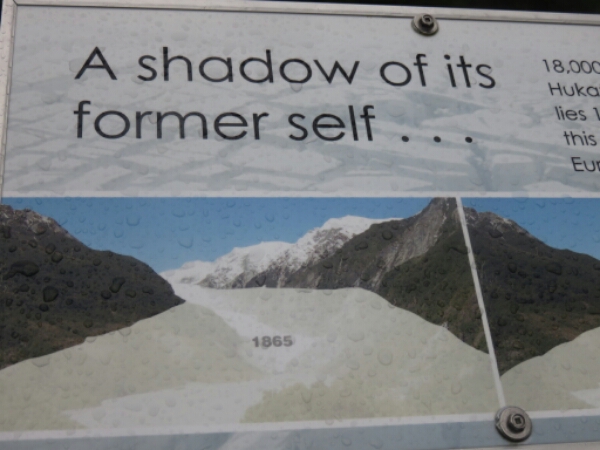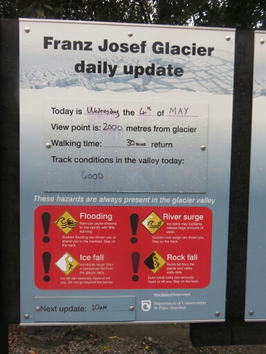 At the car park there are a few walk options, but on the signs it says that the main ones are closed due to flooding, so we try the end of the forest walk first to see what there is to look at, but don’t get that far along at all. There is a sign stopping anyone going further highlighting the dangers of following guided tours, due to falling rocks and landslides during rain as the guides will have the appropriate equipment like ice picks and walkie talkies. So only option is for us to go up the Sentinel Rock walk which is really nice actually and only takes about 15 minutes return. The view is over the river and you can see in the far distance the start of the glacier, although it is hard to see as has melted so much over the years. There is an info board showing how over the 100 years it has changed and shows that where we are standing on the lookout, was actually at one time right in the middle of the glacier. And it explains how in 2010 there were some big blocks of it that came down and is the reason that now you can only access it by helicopter. With all the rain there are a lot of waterfalls surrounding us and it is really relaxing just being up there taking in the nice views.