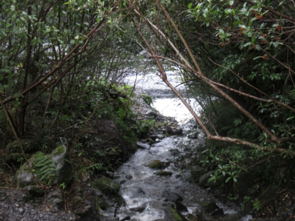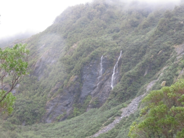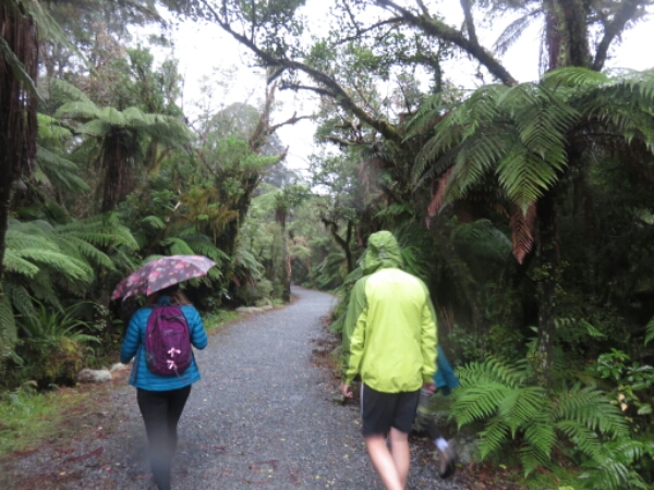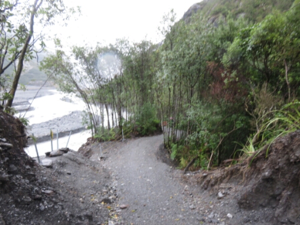Up early after having an early night, it’s good to be able to make the most of the free breakfast at the Rainforest hostel, which is cereals or toast. Sitting with the UK girls Essie and Charlotte, the rest of the group isn’t up yet and as it is a bit of a write off weather wise for any glacier walking due to the monsoon type rain, I don’t expect many to be up before noon. So to try and make the most of the day and make use of the poncho and waterproof trousers have been carrying about since Borneo, we decide to try the walk to see the glacier, which is an hour to the car park where it starts and then another hour half return walk, so not too long or hard. Joined by the girls room mate Shaun, we head off into the rain for the walk, which is quite nice along the river, although it is a very grey river and looks like someone has used the water to wash off paint brushes. As it is so cloudy you can’t see much walking along of the mountains. We carry up the road until it goes into a rainforest walk for about 20 minutes, until we reach the car park. Not managing to avoid the really heavy rain so far, I already have wet feet and looking forward to getting back for a nice shower.
