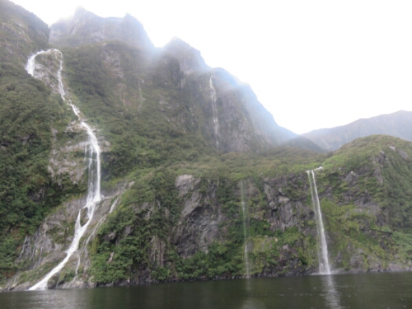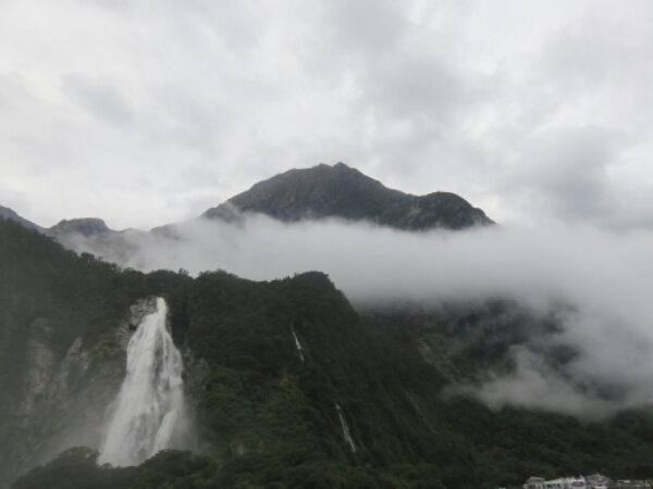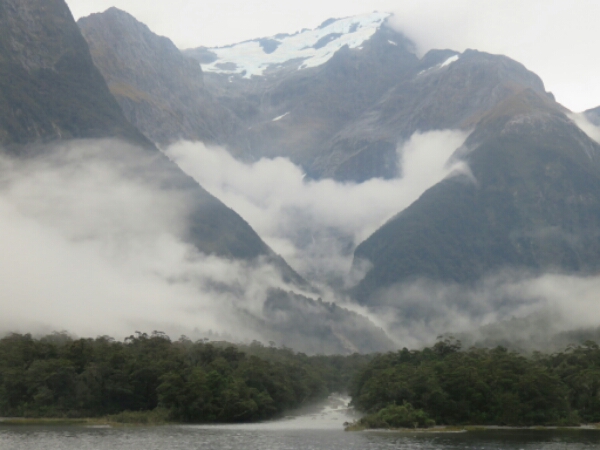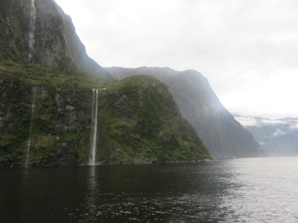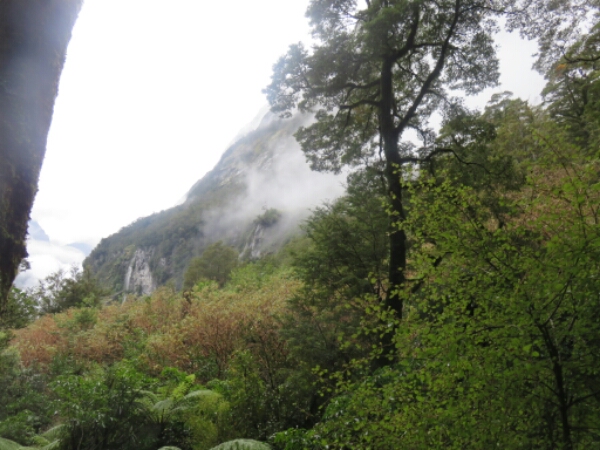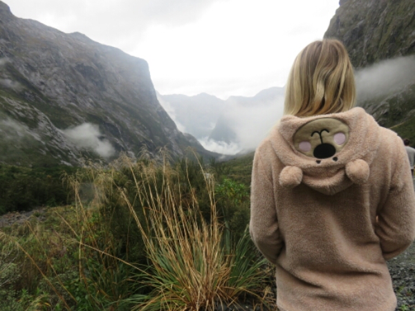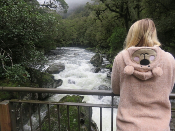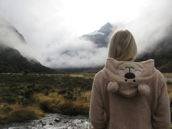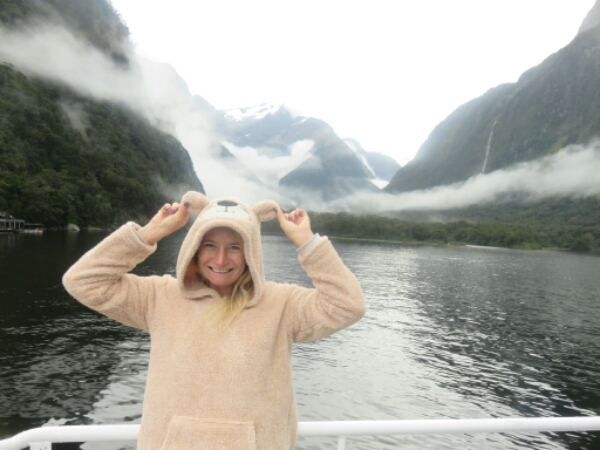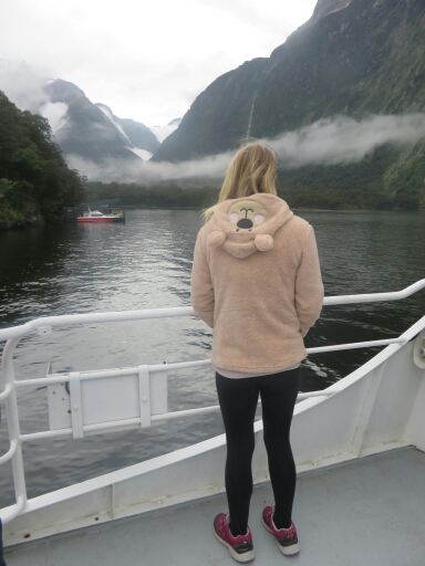 Early start, but wake up fine as had an easy night so good sleep. Even up early enough to grab the free toast and make a tea to go as it’s a long coach to Milford. Wearing the bear as it’s cold and thought it might be cool for bear to have a day out at the famous Milford Sounds. Our driver is a guy called Digger who is interesting to listen to cracking a few jokes along the way. I sit next to Ida and for the first part most people sleep as there are too many clouds to appreciate the good views. Digger even puts on a video of Milford for us to watch – a bit of an attenburgh type film not so bad.