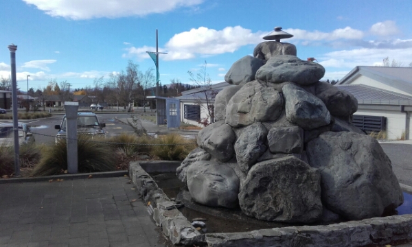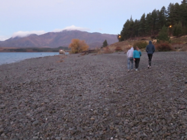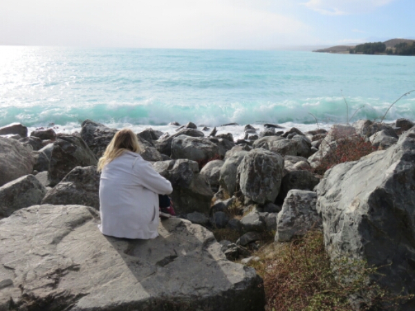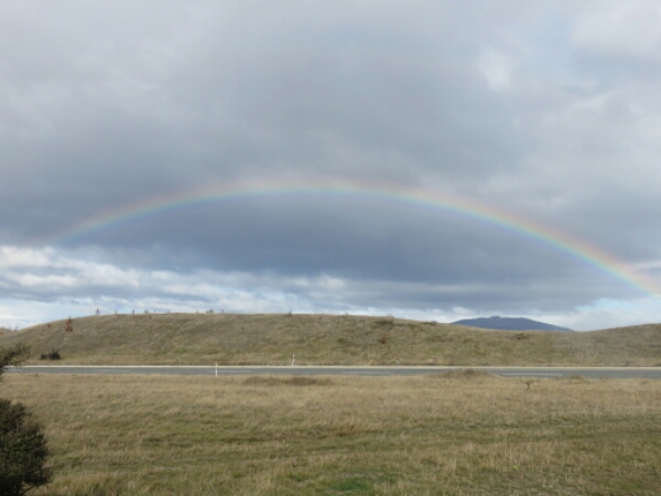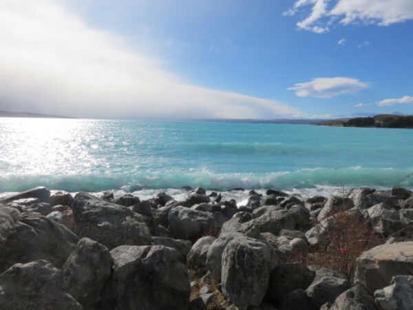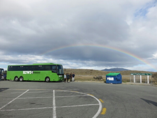 The bus is a longish journey taking about 5 hours with 2 stop offs in GERALDINE where we just grab a tea and a cool lake PUKAKI that is the most gorgeous colour blue tourquise colour. Surrounded by rocks we get a few cool pics with some guys hiding behind them that looks good for a photo and even get a rainbow over the kiwi bus that looks nice – maybe the new kiwi image for them to use for marketing. Seems we get the last of the sunshine here for the day as the rain follows us all way to Tekapo and also means we can’t see mount Cook as usually it is a good spot – well not maybe the top as too high but at least some of it.