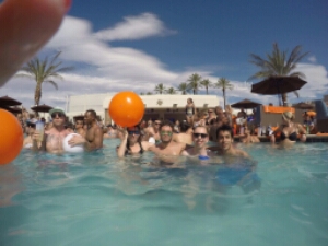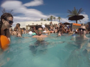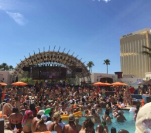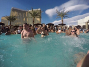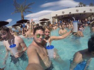 So once inside its a really good vibe and busy, but not too much. Definitely busier than when I went couple of years ago maybe time of year or maybe disclosure pulling people in. The drinks here are similar price to MGM about $40 (£30) for a large cocktail and just get a couple throughout the day. It’s a refreshing pool and as it is super hot we all stay in there getting involved in the constant flow of beach balls being thrown around the pool and floating killer whales. It’s cool AJ has his go pro as get some good pictures during the day.